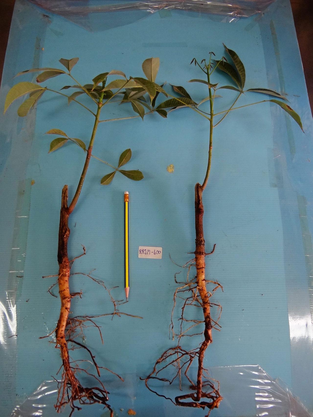 เมื่อถอนต้นขึ้นมาตรวจวิเคราะห์ ระบบรากค่อนข้างสมบูรณ์และแข็งแรง มีระบบรากแก้ว ไม่ขด ไม่งอ ไม่ขาด ส่งผลให้รากสามารถชอนไชไปหาอาหารเพื่อส่งไปเลี้ยงส่วนต่างๆของต้นยางได้ดี ประสิทธิภาพของการให้น้ำยางสูงกว่า