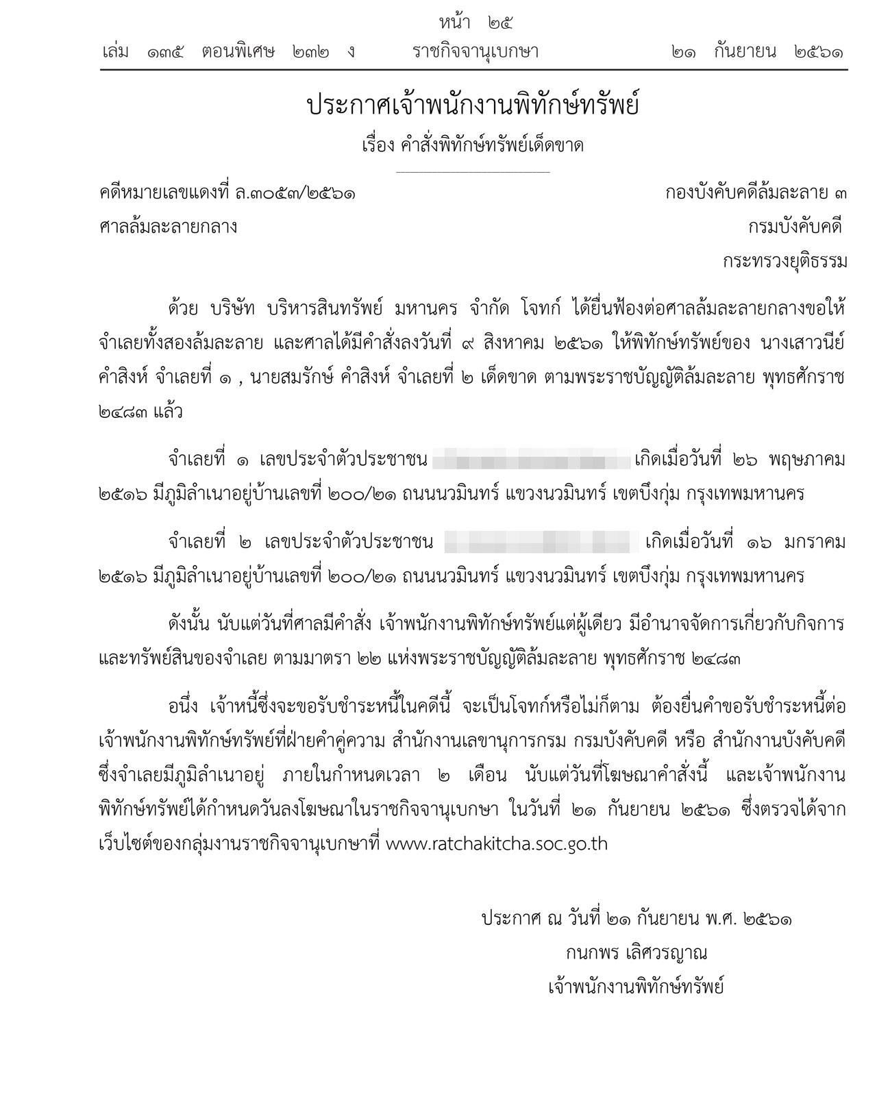 ด้วย บริษัท บริหารสินทรัพย์ มหานคร จํากัด ได้ยื่นฟ้องต่อศาลล้มละลายกลางขอให้จําเลยทั้งสองล้มละลาย และศาลได้มีคําสั่งลงวันที่ ๙ สิงหาคม ๒๕๖๑ ให้พิทักษ์ทรัพย์ของ นางเสาวนีย์ คำสิงห์ จําเลยที่ ๑, นายสมรักษ์ คําสิงห์ จําเลยที่ ๒ เด็ดขาด ตามพระราชบัญญัติล้มละลาย พุทธศักราช ๒๔๘๓ แล้ว