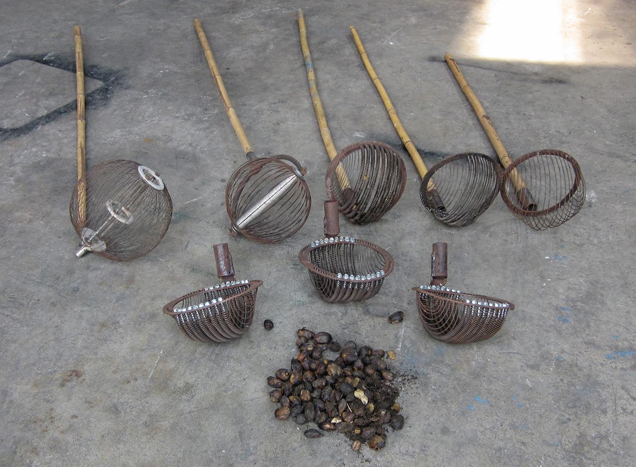 “แบบแรก เป็นเครื่องมือแบบตะกร้อวงกลม ที่ประกอบลวดสปริงมีเส้นผ่าศูนย์กลาง 20 ซม. ใช้ลวดทำจากลวดสปริงคอยล์ขนาดเส้นผ่าศูนย์กลาง 10 มม. หนา 2 มม.ใช้สปริงคอยล์ 7 เส้น ส่วนด้านข้างที่ไม่ได้รับแรงกดใช้เป็นลวดสปริง หนา 2 มม. ทำงานโดยใช้หลักการของความยืดหยุ่นของลวดสปริงคอยล์ในการกางและหุบ ขณะที่กดลงบนเมล็ดปาล์มจะเด้งเข้าไปอยู่ด้านในตะกร้อจนเต็ม และหากจะเอาเมล็ดปาล์มออกจากตะกร้อสามารถเทออกได้โดยตรง มีราคาต้นทุนแค่ 500 บาท หลังจากนำไปทดลองใช้ สามารถเก็บผลปาล์มร่วงได้ ในอัตรานาทีละ 2.10 กก. เมื่อเปรียบเทียบกับใช้แรงงานคนก้มเก็บที่ได้แค่ 2.01 กก. เก็บได้เร็วกว่าหน่อยนึง แต่ไม่เมื่อยหลัง”