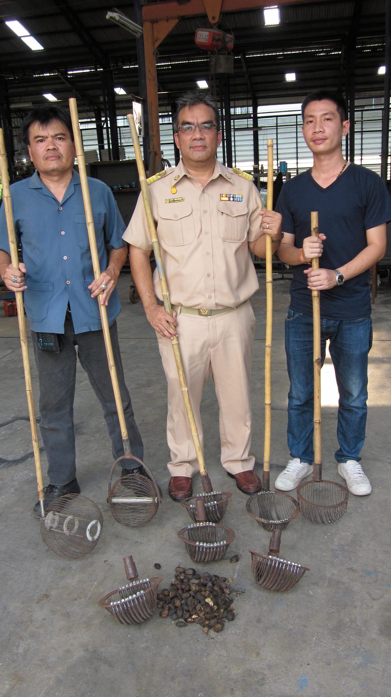 “การเก็บเกี่ยวปาล์มน้ำมันที่มีลำต้นสูง เมื่อตกลงพื้นเมล็ดมักแตกกระจายเกลื่อนสวน ไร่ละ 10 กก. หากทิ้งไว้เมล็ดพวกนี้จะกลายเป็นต้นเล็ก หรือปาล์มวัชพืช งอกขึ้นมาแย่งน้ำ แย่งอาหารต้นปาล์มหลัก เกษตรกรต้องใช้วิธีการเดินก้มเก็บเกิดความเมื่อยล้า ยิ่งมีมากต้องเสียเงินจ้างแรงงานเพิ่ม สถาบันวิจัยเกษตรวิศวกรรม กรมวิชาการเกษตร จึงออกแบบและพัฒนาเครื่องมือเก็บผลปาล์มร่วงในหลายลักษณะเพื่อนำมาช่วยเหลือเกษตรกร”