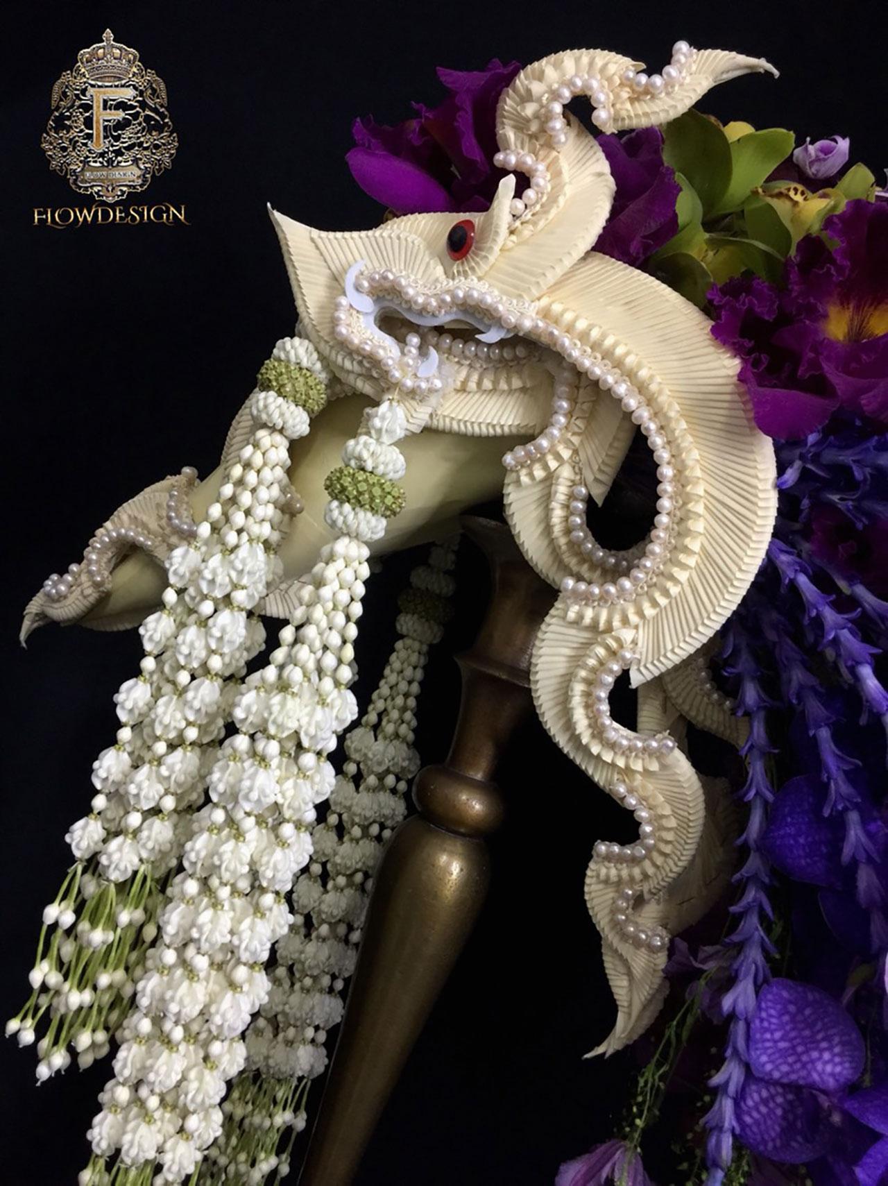 งานนี้ นายปิยวัฒน์ บอกว่า ถือว่ายากมากตรงจุดที่มีข้อกำหนดต้องมีดอกไม้ไทยสีสดๆ อย่างน้อย 3 สี ตรงฐานช่อตรงรูปนาค จะใช้ผ้าซาตินมาเย็บแบบและร้อยมุกอย่างสวยงาม ซึ่งแต่ละช่อมีความต่าง แต่ต้องเป็นไปในทิศทางเดียวกัน แต่ก็ทำได้จนสำเร็จ ส่งถึงมือก่อนงานประกวดจะเริ่มขึ้นไม่กี่ชั่วโมง ถือเป็นความภาคภูมิใจอย่างยิ่งที่มีโอกาสในครั้งนี้