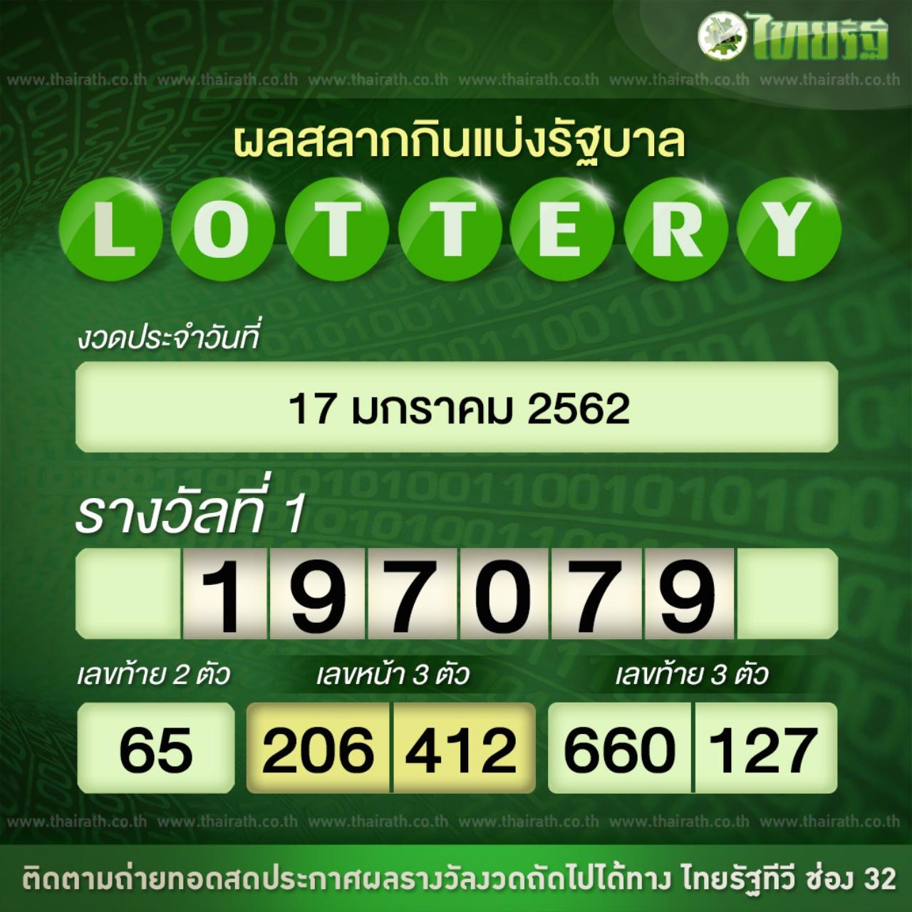 "ตรวจหวย" "ชมสด" การออก "สลากกินแบ่งรัฐบาล" งวดวันที่ 17 มกราคม 2562 ถ่ายทอดผ่านไทยรัฐทีวี ตั้งแต่ 14.00 น. ลุ้นใครจะได้เป็นเศรษฐีคนใหม่...