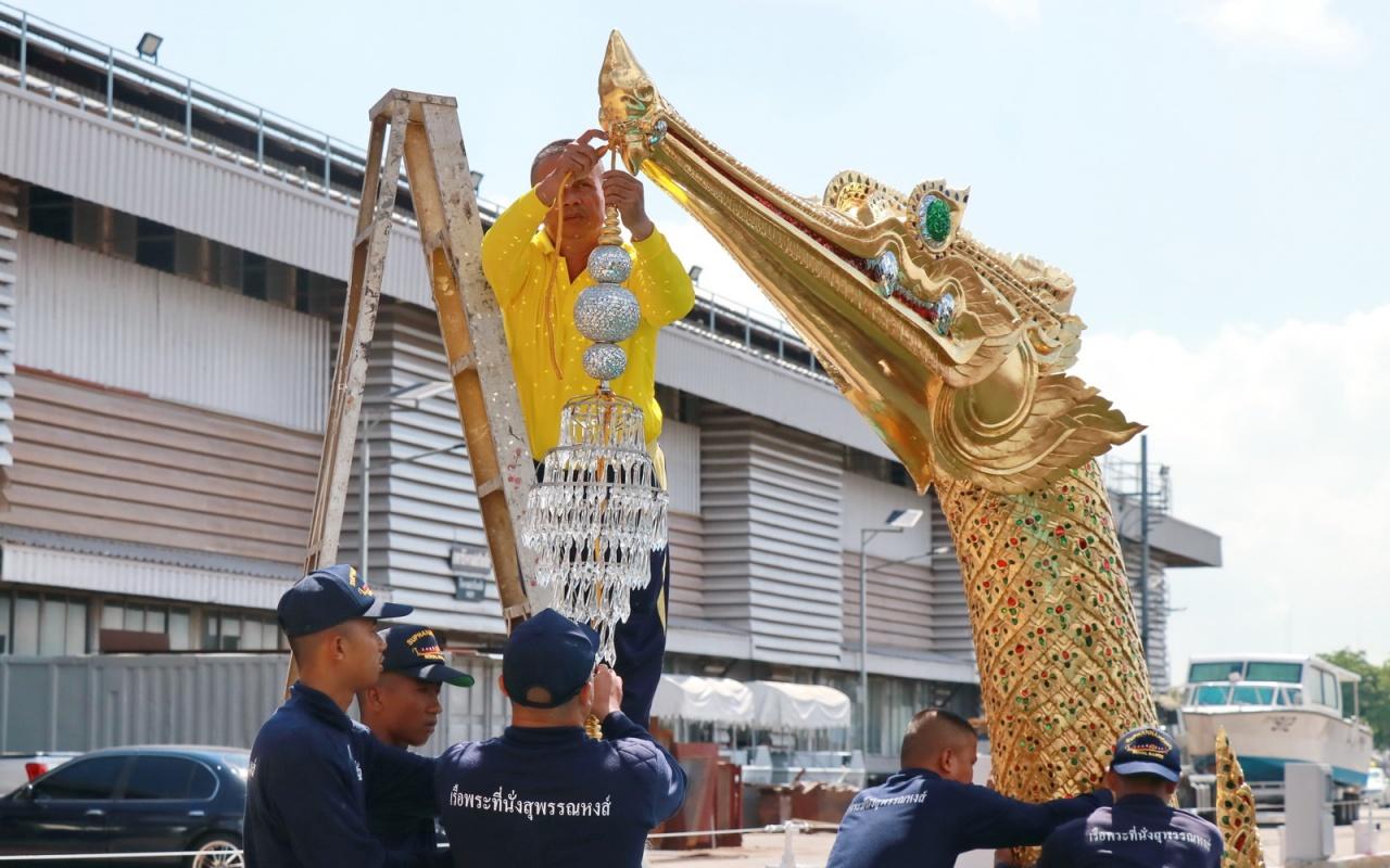 ต่อมา เวลา 10.00 น. ถึงช่วงสำคัญของการตกแต่งเรือพระที่นั่ง ที่มีความงดงามจนเป็นเอกลักษณ์ของชาติ เมื่อ น.ท.ณัฐวัฏ อร่ามเกลื้อ รอง ผอ.กองเรือเล็ก กรมการขนส่งทหารเรือ ในฐานะครูฝึกกำลังพลฝีพายขบวนพยุหยาตราชลมารค รับหน้าที่ในการนำพู่ห้อย ซึ่งเป็นเครื่องประดับชิ้นสำคัญนำขึ้นติดตั้งที่ส่วนหัวเรือสุพรรณหงส์ โดยพู่ห้อยทำจากแก้วเจียระไนเป็นชิ้นๆ นำมาประกอบกัน ตัวพู่ทำจากขนจามรีจากเนปาล ลักษณะขนสีขาว นุ่มละเอียด นำมาประกอบทำเป็นชั้นๆ ตามทรงของพุ่มที่เป็นแบบอยู่ข้างใน แล้วจึงตกแต่งให้สวยงาม จากนั้นกำลังพลประจำเรือพระที่นั่งสุพรรณหงส์ เริ่มทำการฝึกซ้อมย่อยด้วยการพายเรืออยู่กับที่ และซ้อมท่าการถวายบังคม เป็นการเตรียมความพร้อม ในการฝึกซ้อมใหญ่เสมือนจริงที่จะมีขึ้นในวันที่ 30 เม.ย.
