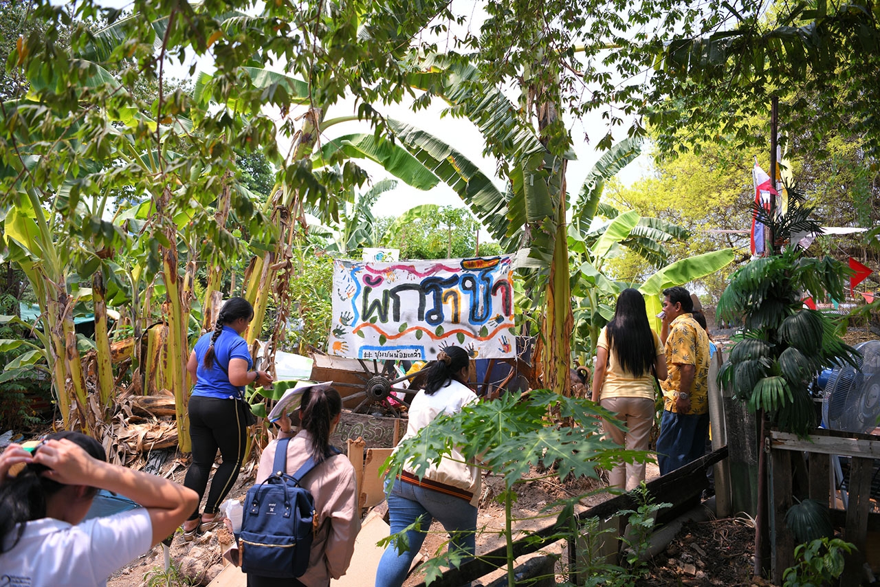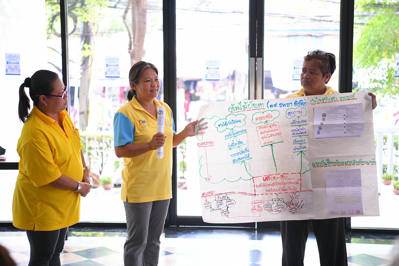 นางนวลใย พึ่งจะแย้ม อาชีพแม่ค้า ชุมชนน้อมเกล้า เขตวังทองหลาง กล่าวว่า ก่อนหน้าจะเข้าร่วมโครงการ ตนประสบปัญหาภาวะน้ำหนักตัวมาก สาเหตุมาจากความเครียดเรื่องค่าใช้จ่ายในครอบครัวและความสัมพันธ์กับสามี และมีความรู้สึกว่าต้องแบกรับภาระค่าใช้จ่ายในบ้านเพียงลำพัง เมื่อตัดสินใจเข้าร่วมโครงการจากคำชักชวนของเพื่อนที่เป็นหมอสุขชุมชน ตนได้ทำแบบประเมินคุณสมบัติของผู้นำจำนวน 8 ข้อ และแบบประเมินความสุขความทุกข์ เพื่อตรวจสอบตัวเองว่าอะไรคือความสุข-ทุกข์ และถ้าเปลี่ยนแปลงพฤติกรรมแล้วจะเป็นอย่างไร จนกระทั่งพบสาเหตุปัญหาว่ามาจากการไม่พูดคุยเปิดใจกับสามี สามีจึงไม่ทราบว่าภรรยาต้องแบกรับภาระอะไรบ้าง หลังจากนั้นตนจึงเริ่มเปิดใจคุยกันมากขึ้น โดยทำบัญชีรายรับรายจ่ายร่วมกัน และรายงานผลความคืบหน้าให้หมอสุขชุมชนทราบเป็นระยะ ซึ่งล่าสุดตนได้ผ่านระดับการเป็นอาสาสมัครสร้างสุข และกำลังเตรียมตัวเป็นหมอสุขชุมชน ชุมชนน้อมเกล้า เขตวังทองหลาง