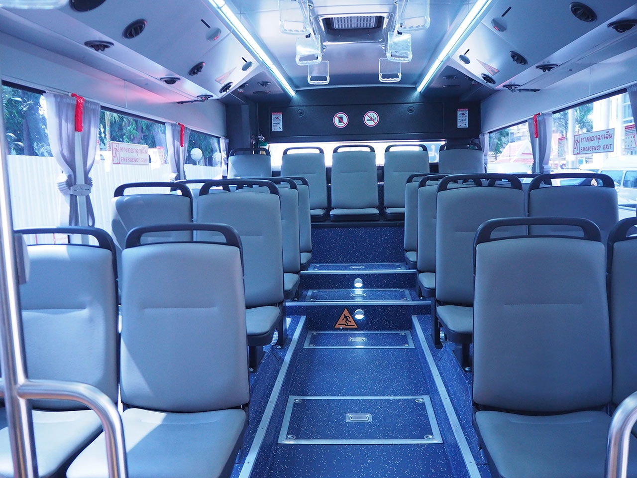 สะดวกสบายมากยิ่งขึ้น ด้วยระบบปรับอากาศขับเคลื่อนด้วยระบบไฟฟ้า สามารถทำความเย็นได้เต็มประสิทธิภาพตลอดเวลา ระบบรองรับน้ำหนักแบบถุงลม ให้ความนิ่มนวลแก่ผู้โดยสาร และปลอดภัยมากยิ่งขึ้นด้วยระบบ ES Start ช่วยป้องกันไม่ไห้รถถอยกลับเมื่อจอดบนทางชัน พร้อมระบบเบรก ABS เพิ่มประสิทธิภาพในการเบรกมากยิ่งขึ้น ตัวถังใช้วัสดุป้องกันการลามไฟ รวมถึงติดตั้งอุปกรณ์เพื่อความปลอดภัยอื่นๆ ตามประกาศกรมการขนส่งทางบก