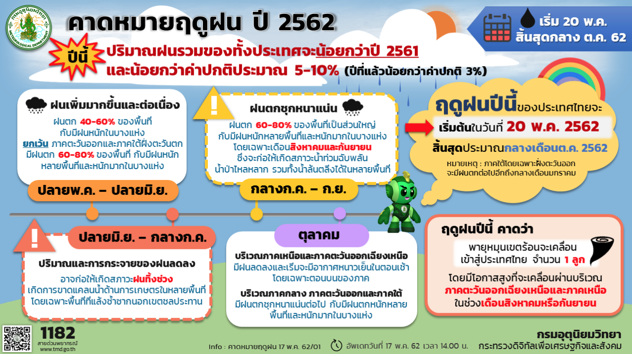 วันที่ 17 พ.ค. 62 กรมอุตุนิยมวิทยา ประกาศการเริ่มต้นฤดูฝนของไทยจะเริ่มขึ้นในวันที่ 20 พ.ค. 62 เนื่องจากประเทศไทยมีฝนตกชุกต่อเนื่องและเพิ่มพื้นที่มากขึ้นครอบคลุมพื้นที่ส่วนใหญ่ของประเทศ ประกอบกับลมที่พัดปกคลุมประเทศไทย โดยปริมาณฝนรวมของทั้งประเทศจะน้อยกว่าปี 2561 และน้อยกว่าค่าปกติประมาณ 5-10 %