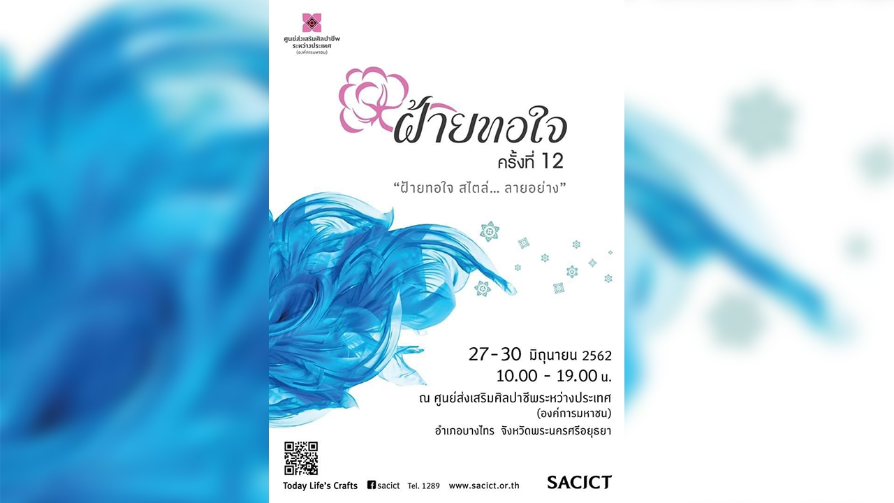 SACICT ขอเชิญชวนทุกท่านร่วมเป็นกำลังใจและสนับสนุนงานศิลปหัตถกรรมไทยจากฝีมือชั้นครู ที่งาน “ฝ้ายทอใจ ครั้งที่ 12” ระหว่างวันที่ 27-30 มิถุนายน 2562 ตั้งแต่เวลา 10.00-19.00 น. ณ ศูนย์ส่งเสริมศิลปาชีพระหว่างประเทศ (องค์การมหาชน) อ.บางไทร สอบถามเพิ่มเติมโทร. 1289 หรือ facebook.com/sacict