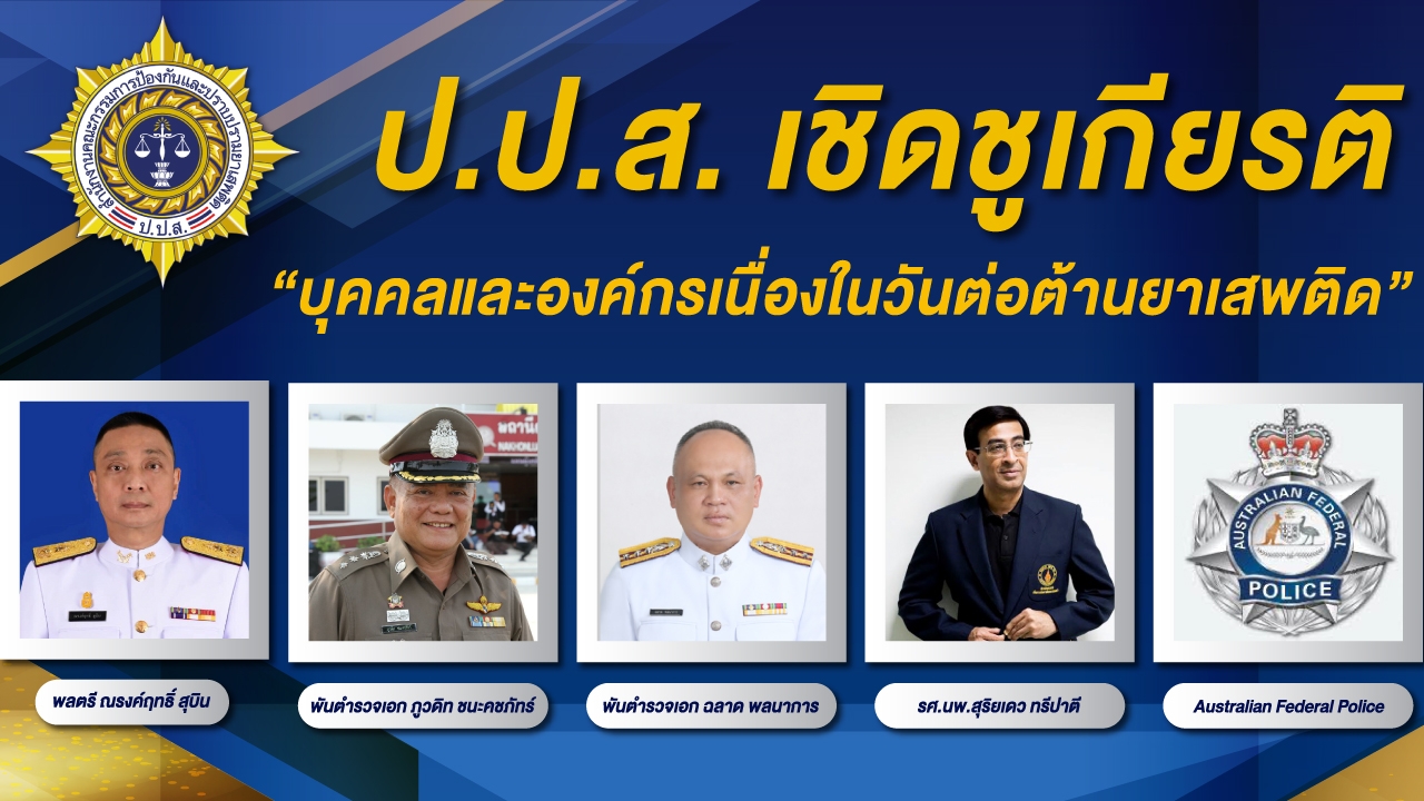 นอกจากนี้ สำนักงาน ป.ป.ส. ยังให้ความสำคัญกับผู้ปฏิบัติงานยาเสพติดที่สูญเสียชีวิต โดยมอบโล่เชิดชูเกียรติฯ ให้กับทายาทของผู้สูญเสียชีวิตจากการปฏิบัติงานด้านการปราบปรามยาเสพติด จำนวน 5 ราย และมอบโล่ให้กับ ผู้เสียสละในการปฏิบัติงานป้องกันและแก้ไขปัญหายาเสพติด ที่ได้รับบาดเจ็บขณะปฏิบัติหน้าที่ จำนวน 22 ราย รวมทั้งมอบโล่ขอบคุณให้กับศิลปินหรือผู้ที่มีชื่อเสียง ที่ร่วมรณรงค์สร้างแรงบันดาลใจ เพื่อต้านภัยยาเสพติด เนื่องในวันต่อต้านยาเสพติดโลก (26 มิถุนายน) ประจำปี 2562 จำนวน 10 ราย ได้แก่ เฌอปราง BNK48,ครูลูกกอล์ฟ คณาธิป, ปู่จ๋าน ลองไมค์, เจมส์ จิรายุ, โบว์ เมลดา, แก้ม วิชญาณี, ต๊ะ พิภู, อิ้งค์ วรันธร, ทอย ปฐมพงศ์ และดาร์ลิ่ง อารดา