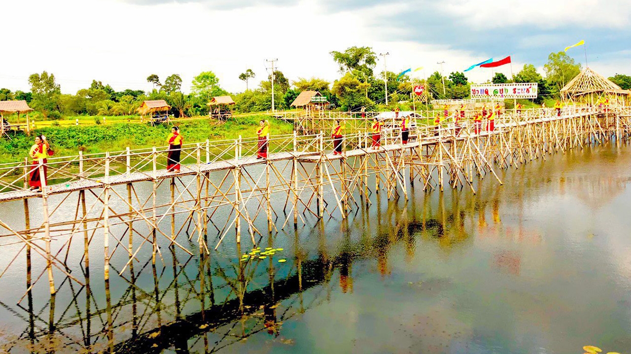 แต่เพราะต้องแวะเข้าศรีสะเกษ เพื่อไปดู สะพานไม้ไผ่ที่บุ่งกระแซง อ.โนนคูณ ที่กำลังเป็นจุดเช็กอินแห่งใหม่ของศรีสะเกษ...ซึ่งก็ไม่มีอะไรมาก เป็นสะพานไม้ไผ่ ยาวประมาณ 300 เมตร กว้าง 1 เมตร ทอดยาวลงไปกลางบึงบุ่งกระแซง เป็นแหล่งท่องเที่ยวแห่งใหม่ของบ้านบก ให้นักท่องเที่ยวได้เดินข้ามไปเยี่ยมชมทุ่งบัวแดง ...แต่ก็ได้อารมณ์ฟิน...ในช่วงหน้าฝนหรือ Green ซีซันแบบนี้