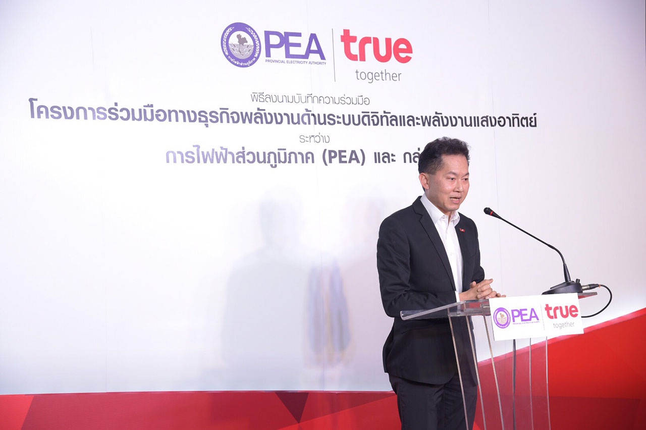 นายพิรุณ ไพรีพ่ายฤทธิ์ ผู้อำนวยการด้านภาครัฐและภาคการศึกษา บริษัท ทรู คอร์ปอเรชั่น จำกัด (มหาชน) กล่าวว่า “กลุ่มทรู มีความยินดีเป็นอย่างยิ่งที่ได้ร่วมมือกับ PEA ในการศึกษาและพัฒนาการนำเทคโนโลยีดิจิทัลมาใช้ในด้านพลังงาน โดยกลุ่มทรูมีความพร้อมที่จะนำความเชี่ยวชาญและศักยภาพของโครงสร้างพื้นฐานโทรคมนาคมและการให้บริการด้านดิจิทัล ช่วยยกระดับการใช้ชีวิตให้สะดวกสบาย มีประสิทธิภาพ และสร้างประโยชน์ต่อสังคม สิ่งแวดล้อม และเศรษฐกิจของประเทศ ซึ่งความร่วมมือในครั้งนี้ นอกจากจะมีการติดตั้ง Solar Rooftop ที่สถานีฐานทรูมูฟ เอชทั่วประเทศ เพื่อช่วยลดการใช้พลังงานไฟฟ้าแล้ว กลุ่มทรูจะนำนวัตกรรมเทคโนโลยี IoT มาช่วยในการพัฒนาการบริหารจัดการพลังงานอย่างยั่งยืนทั้งภาคธุรกิจและพลังงาน ซึ่งนับว่ายังเป็นเรื่องใหม่และมีความสำคัญในการขยายโครงการต่อไปในอนาคต นอกจากนี้ มีความร่วมมือในการนำบริการด้านดิจิทัลมาช่วยพัฒนาและเพิ่มศักยภาพการให้บริการด้าน Digital Platform ต่างๆ ของ PEA อีกด้วย