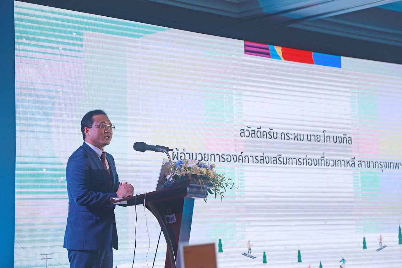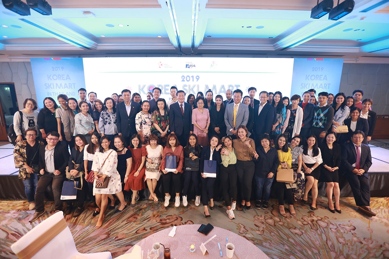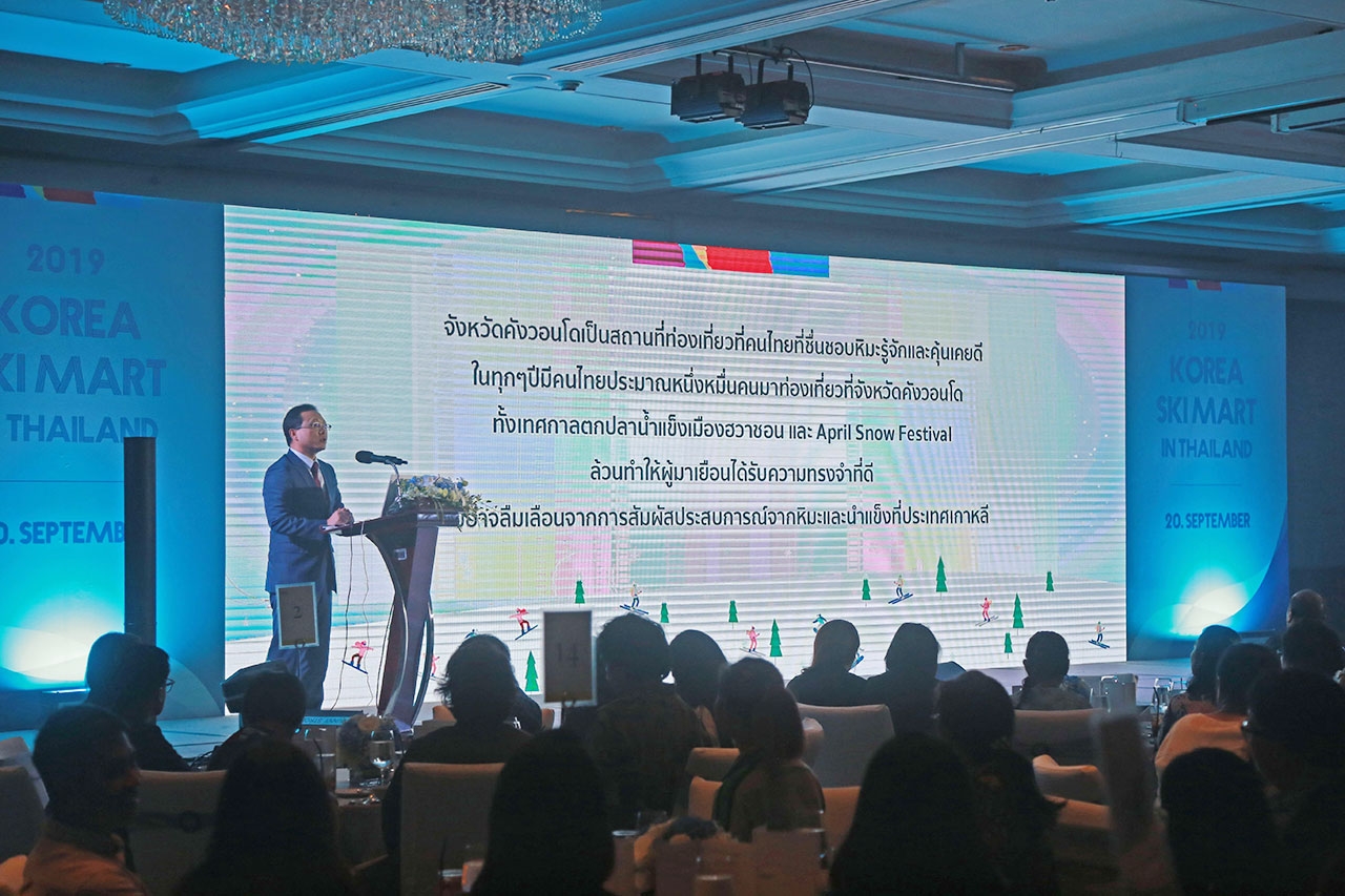 นาย โก บง กิล ผู้อำนวยการองค์การส่งเสริมการท่องเที่ยวเกาหลีประจำประเทศไทย ร่วมกับ นาย จอง มัน โฮ รองผู้ว่าราชการจังหวัดคังวอนโด ร่วมจัดงาน “Korea Ski Travel Mart 2019” จุดประสงค์เพื่อเสริมสร้างความสัมพันธ์อันดีระหว่างธุรกิจท่องเที่ยวด้านสกีรีสอร์ตของเกาหลี และบริษัทท่องเที่ยวในประเทศไทย และเพื่อเป็นการอัปเดตข่าวสารข้อมูลล่าสุดทางด้านการบริการ และสิทธิประโยชน์มากมาย เพื่อมอบให้แก่บริษัทนำเที่ยวของประเทศไทย ในการวางโปรแกรมทัวร์เกาหลีในช่วงฤดูหนาวที่จะถึงนี้ (ธันวาคม 2562-กุมภาพันธ์ 2563) จาก 10 สถานเล่นสกีระดับแนวหน้าของประเทศเกาหลี รวมถึงร่วมลุ้นจากการจับรางวัลพิเศษภายในงาน