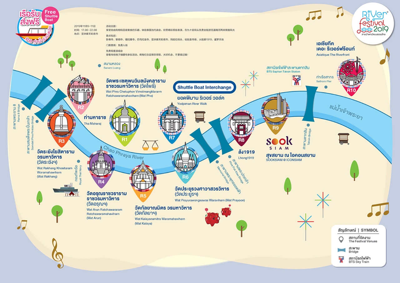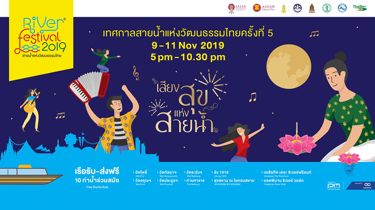 River Festival เทศกาลสายน้ำแห่งวัฒนธรรมไทย นับเป็นหนึ่งในงานเทศกาลวัฒนธรรมร่วมสมัยที่งดงาม และยั่งยืนมากที่สุดงานหนึ่ง โดยการร่วมมือของหลายภาคส่วน ตั้งแต่ภาครัฐ ภาคเอกชน ภาคชุมชน และพันธมิตรริมน้ำเจ้าพระยา จากจุดเริ่มต้นของการถ่ายทอดวิถีความงามแห่งชีวิตเคียงข้างสายน้ำ นำไปสู่ความสุขสันต์ที่โอบกอดหัวใจของผู้คนที่ได้มาเยือนอีกมากมาย จนกระทั่งปีนี้ได้ดำเนินมาถึงปีที่ 5 River Festival 2019 เทศกาลสายน้ำแห่งวัฒนธรรมไทย ครั้งที่ 5 ‘เสียงสุขแห่งสายน้ำ’
