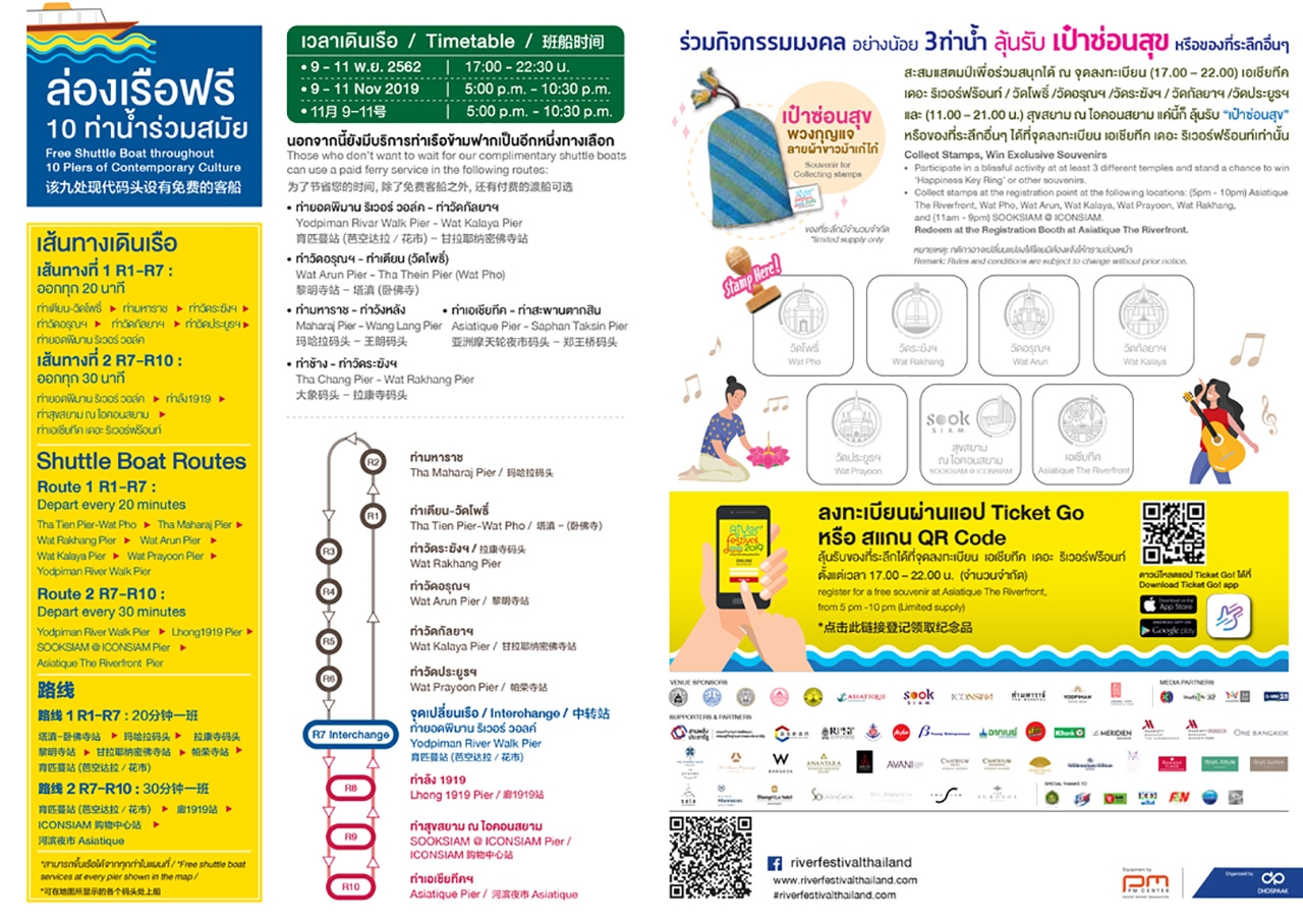 และเช่นเดียวกัน ปีนี้ผู้ที่มาร่วมงานเทศกาลสายน้ำแห่งวัฒนธรรมไทยครั้งนี้ ยังสามารถเดินทางในเส้นทางแห่งความสุขไปยังท่าน้ำร่วมสมัยทั้ง 10 ท่าได้ด้วยเรือรับส่งฟรี ตั้งแต่เวลา 17.00 น. – 22.30 น. โดยยังเพิ่มเติมความสนุกให้ผู้เข้าร่วมงานที่ประทับตราที่ 3 ท่าน้ำขึ้นไป สามารถลุ้นรับของที่ระลึกในเทศกาลได้ "เป๋าซ่อนสุข" พวงกุญแจ ผ้าขาวม้าเก๋ไก๋ หรือรับของที่ระลึกอื่นๆ ได้ที่จุดลงทะเบียน ที่ท่าน้ำ เอเชียทีค เดอะ ริเวอร์ฟร้อนท์