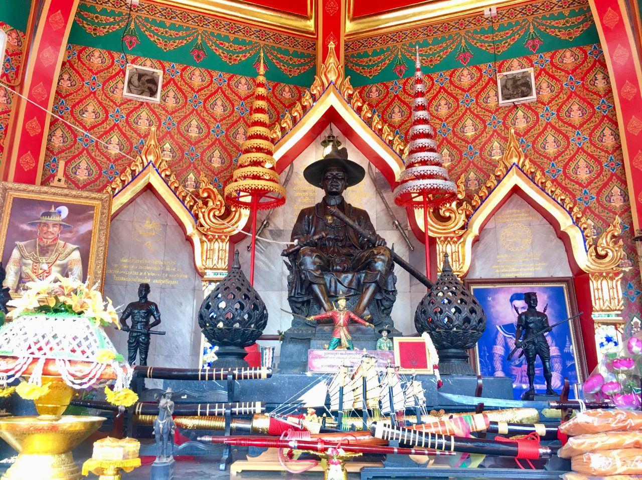 สำหรับที่นี่...ผู้คนส่วนใหญ่นิยมนำพวงมาลัยมาถวาย นอกเหนือจากนั้นก็มีดาบ ม้า และไก่ รวมไปถึงผลไม้ น้ำแดงด้วย แต่สำหรับ "หญิงใบ้" ถ้าร่ำรวยงวดนี้ แวะไปดูหนังกลางแปลงแก้บนกันได้ที่ศาล "พระเจ้าตากสิน" จังหวัดจันทบุรีจ้า