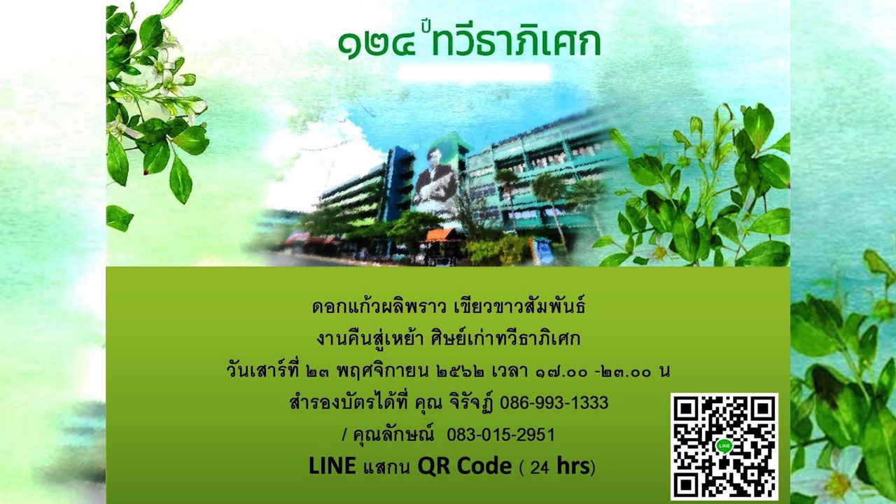 ขอเชิญศิษย์ทุกรุ่น ร่วมงานคืนสู่เหย้า ๑๒๔ ปีทวีธาภิเศก ดอกแก้วผลิพราว เขียวขาวสัมพันธ์ เพื่อจัดหารายได้นำไปสนับสนุนกิจกรรมต่างๆ ของนักเรียน และโรงเรียนทวีธาภิเศก และเพื่อสร้างความสามัคคีในรุ่นพี่รุ่นน้อง รวมทั้งพบปะสังสรรค์ ย้อนรำลึกถึงอดีตในวัยเรียน และรับประทานอาหารร่วมกันในบรรยากาศอันแสนอบอุ่น ในวันเสาร์ที่ 23 พ.ย.2562 ตั้งแต่เวลา 17.00-23.00 น. ณ โรงเรียนทวีธาภิเศก ติดต่อสอบถามและสำรองบัตรได้ที่ คุณจิรัจฏ์ หมายเลขโทรศัพท์ 086-993-1333 หรือคุณลักษณ์ หมายเลขโทรศัพท์ 083-015-2951