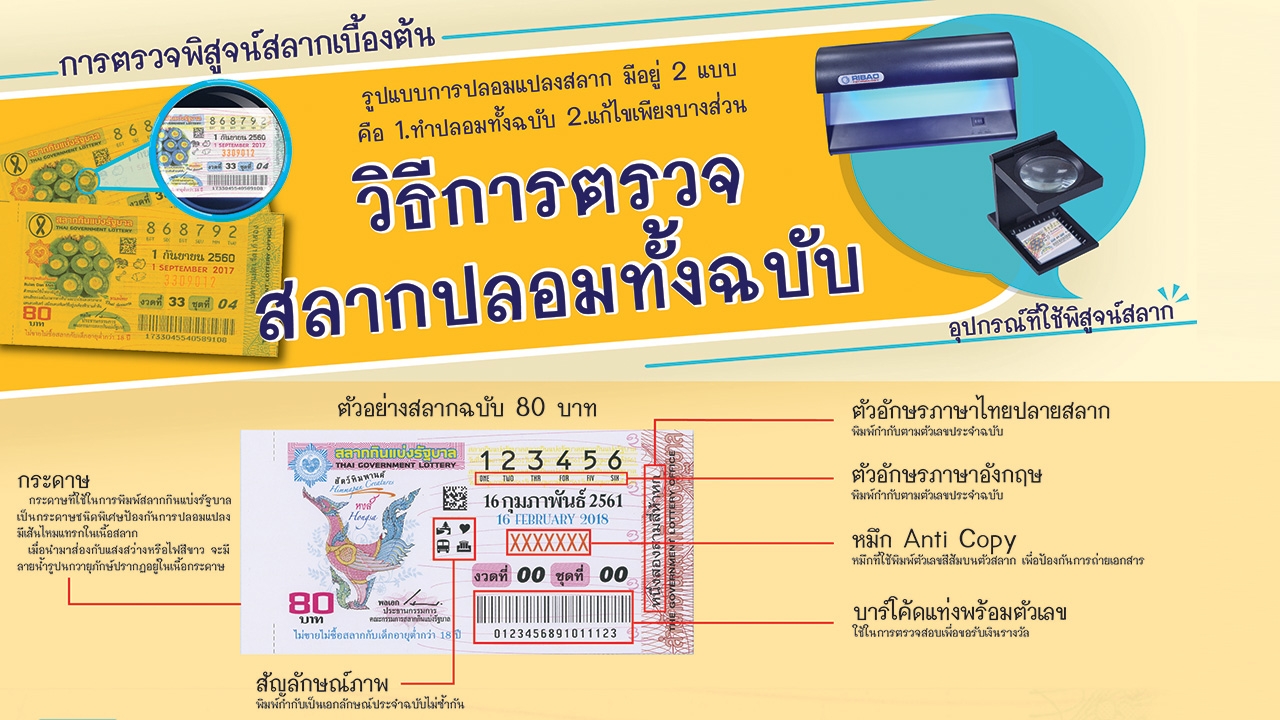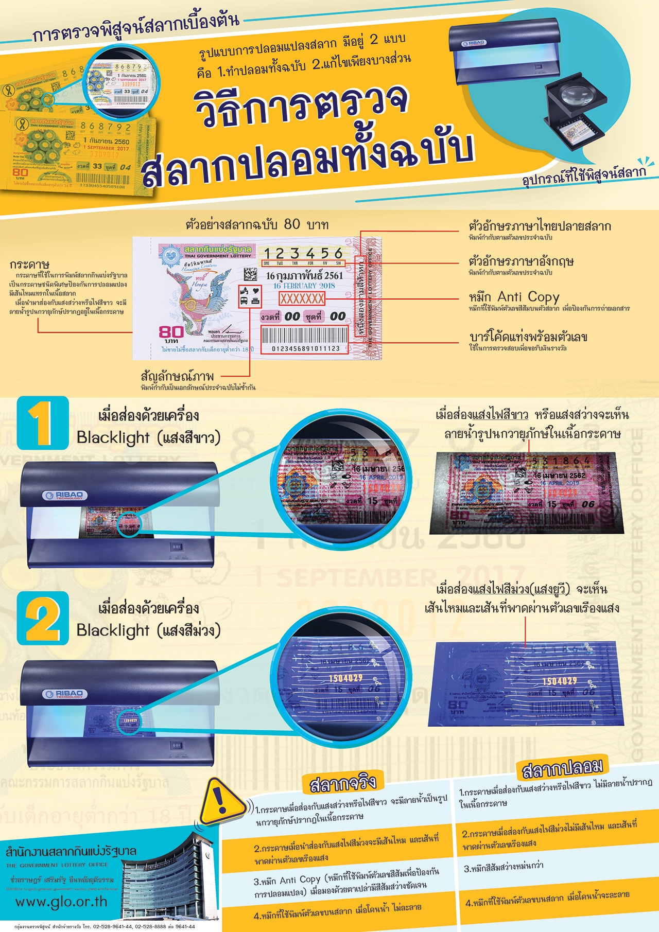 ผู้อำนวยการสำนักงานสลากกินแบ่งรัฐบาล กล่าวต่อไปอีกว่า ปัจจุบัน มิจฉาชีพมีหลากหลายรูปแบบ จึงขอให้ผู้ประกอบอาชีพรับซื้อรางวัล ใช้ความระมัดระวังตรวจสอบสลากอย่างละเอียดถี่ถ้วนมากขึ้น โดยในเบื้องต้นให้ใช้วิธีการเปรียบเทียบกับสลากของจริงของสำนักงานสลากกินแบ่งรัฐบาลในงวดนั้นๆ เพื่อหาความแตกต่างกับสลากที่ต้องการตรวจพิสูจน์ เช่น ตรวจดูคุณลักษณะทั่วไปของสลาก คือความหนาบางของกระดาษ รูปภาพสลาก ขนาดของตัวเลข และขนาดของตัวอักษร และตรวจสอบคุณลักษณะพิเศษของสลาก โดยให้สังเกตว่ากระดาษที่ใช้พิมพ์สลากจะมีลายน้ำในเนื้อกระดาษเมื่อส่องกับแสงไฟสีขาว หรือแสงสว่างจะมองเห็นลายน้ำรูปนกวายุภักษ์ในเนื้อกระดาษ และเมื่อส่องกับแสงไฟสีม่วง (แสงยูวี) จะมองเห็นเส้นไหม และเส้นที่พาดผ่านตัวเลขมีลักษณะเรืองแสง หรืออาจใช้น้ำสะอาดมาถูบนสลาก ซึ่งหมึกที่ใช้พิมพ์ตัวเลขสลากของจริงเมื่อถูกน้ำจะไม่ละลาย