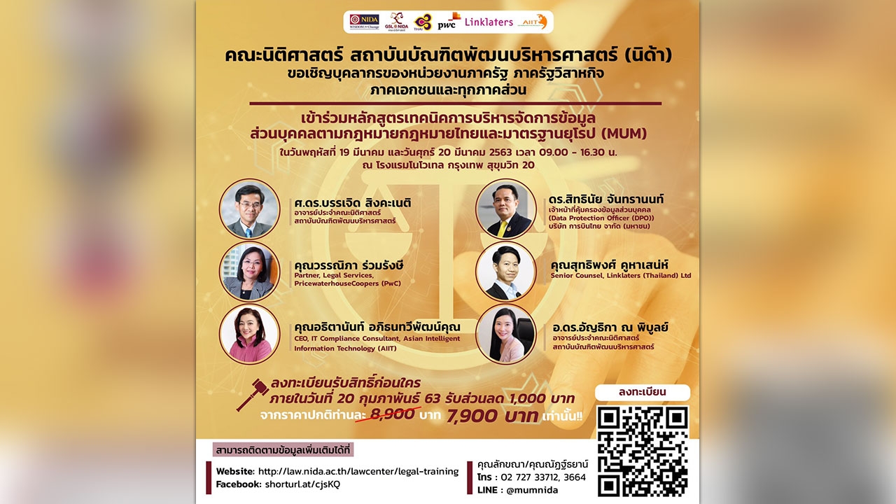 คณะนิติศาสตร์ สถาบันบัณฑิตพัฒนบริหารศาสตร์ (นิด้า) ขอเชิญบุคลากรของหน่วยงานภาครัฐ ภาครัฐวิสาหกิจ ภาคเอกชนที่มีการเก็บรวบรวม ใช้ หรือเปิดเผยข้อมูลส่วนบุคคล และผู้ที่สนใจเข้าร่วมฟังบรรยาย ทำ workshop และชมนิทรรศการจำลองการใช้เครื่องมือต่างๆ เพื่อปฏิบัติตามกฎหมาย ในหลักสูตร