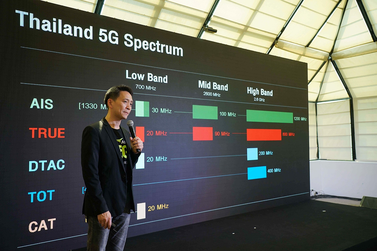 “ในภาพรวมของเครือข่าย AIS 5G จะมีความเร็ว Speed ที่สูงกว่าถึง 24 เท่า และมีขีดความสามารถในการรองรับการใช้งาน Capacity ที่มากกว่าถึง 30 เท่า ขณะที่มี Latency ต่ำกว่าเดิมถึง 10 เท่า ทำให้สัมผัสได้ถึงความเร็ว แรง เสถียร เหนือระดับยิ่งกว่าใคร นอกจากนี้ด้วยมาตรฐานเทคโนโลยี 5G นั้น 3GPP ซึ่งเป็นหน่วยงานตามข้อตกลงความร่วมมือในการพัฒนามาตรฐานทางเทคนิค ระบุว่าคลื่น 700 MHz จะใช้งานได้เต็มประสิทธิภาพสูงสุดที่จำนวนเต็ม 30 MHz (2x15 MHz) ในขณะที่ คลื่น 2600 MHz ต้องมีจำนวน 100 MHz ส่วนคลื่น 26 GHz ต้องมีจำนวน 400 MHz ต่อ 1 Block จึงจะสามารถใช้งาน 5G ได้เต็มประสิทธิภาพ นั่นคือที่มาถึงความตั้งใจของเราในการเข้าประมูลย่านความถี่เพิ่มในครั้งนี้นั่นเอง”