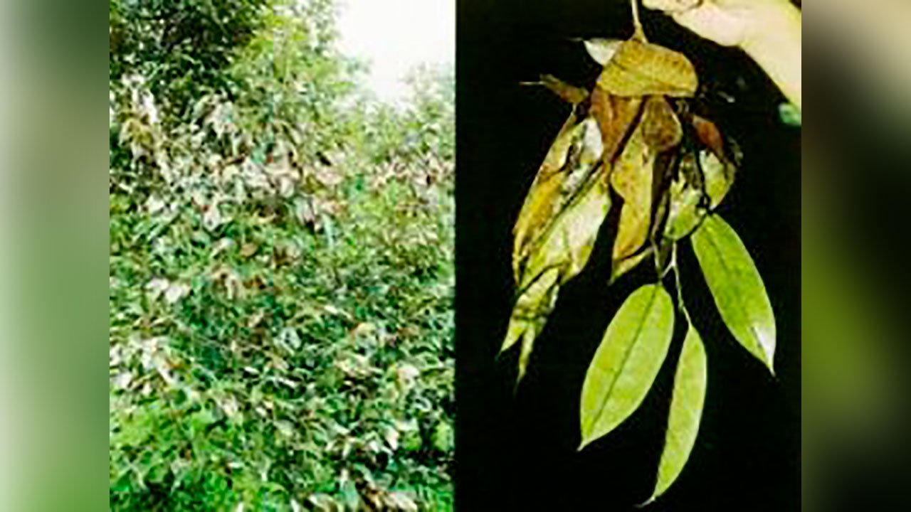 สภาพอากาศระยะนี้ กรมวิชาการเกษตร เตือนเจ้าของสวนทุเรียนที่มีทรงพุ่มหนา และมีความชื้นสูง โดยเฉพาะในภาคใต้เฝ้าระวังการระบาดของโรคใบติดหรือโรคใบไหม้...ที่มีสาเหตุจากเชื้อรา Rhizoctonia solani Kuehn มักพบมากในทุเรียนพันธุ์ชะนีและหมอนทอง