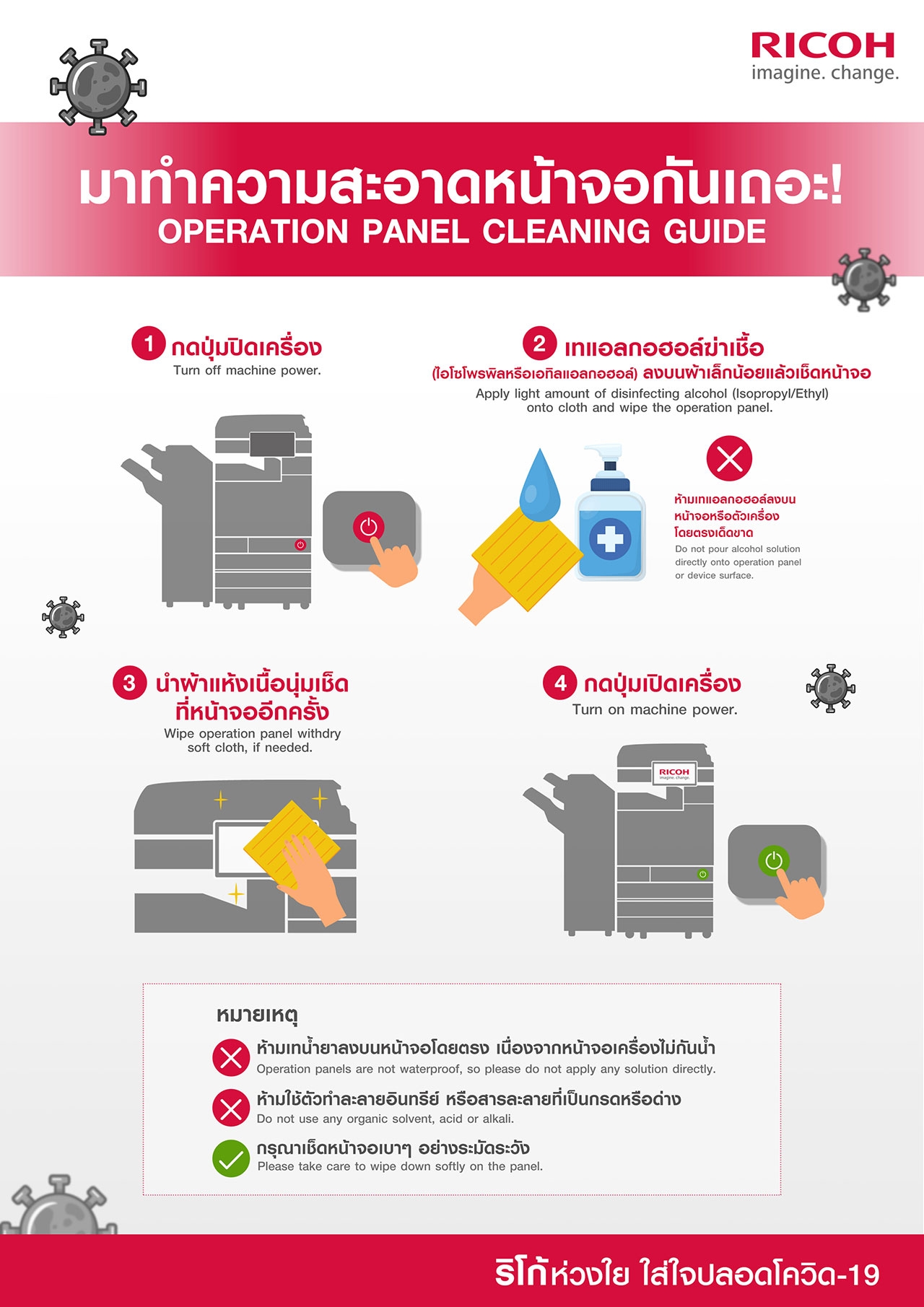 บริษัท ริโก้ (ประเทศไทย) จำกัด ผู้นำตลาดเครื่องถ่ายเอกสารมัลติฟังก์ชันของไทย ได้ตระหนักถึงความสำคัญในการร่วมกันเป็นส่วนหนึ่งในการลดการแพร่กระจายของเชื้อไวรัสโคโรนา 2019 หรือโควิด-19 (COVID-19) จึงอยากชวนทุกคนมาทำความสะอาดอุปกรณ์และเครื่องใช้สำนักงานให้สะอาด เนื่องจากสถานที่ทำงานถือได้ว่าเป็นอีกหนึ่งแหล่งที่ผู้คนจำนวนมากต้องมาทำงานและใช้สิ่งของร่วมกัน ดังนั้นเพื่อป้องกันการแพร่กระจายของเชื้อไวรัส เราทุกคนจึงควรทำความสะอาดอุปกรณ์สิ่งของของตนเองอยู่เสมอ และควรล้างมืออยู่บ่อยครั้ง ส่วนสิ่งของที่ใช้ส่วนรวมก็ควรต้องมีผู้ดูแลและบำรุงรักษาคอยเช็ดทำความสะอาดอยู่เสมอเช่นกัน วันนี้ทางริโก้จึงได้มีการทำอินโฟกราฟิกเรื่องของการทำความสะอาดเครื่องถ่ายเอกสารแบบง่ายๆ ขึ้นมาเพื่อเป็นส่วนหนึ่งให้สังคมตระหนักถึงความสำคัญ และร่วมกันก้าวข้ามวิกฤติโควิด-19 ไปพร้อมกัน เพื่อที่สังคมไทยจะได้กลับมาเข้มแข็งปลอดโรคอีกครั้งหนึ่ง