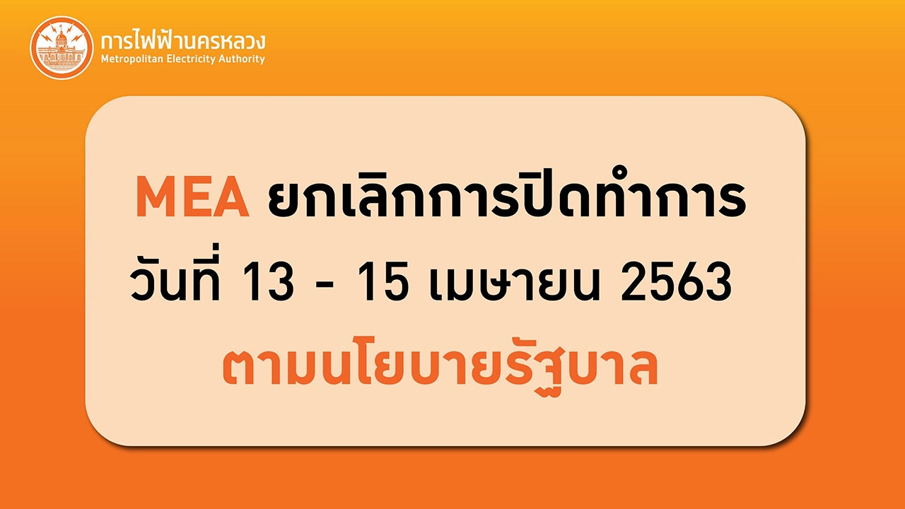ตามที่คณะรัฐมนตรี (ครม.) ได้มีมติเมื่อวันที่ 17 มีนาคม 2563 ให้เลื่อนวันหยุดราชการประจำปี ในวันที่ 13-15 เมษายน 2563 เพื่อเป็นการลดโอกาสการแพร่ระบาดของเชื้อไวรัสโคโรนา 2019 (COVID-19) และยับยั้งการแพร่ระบาดภายในประเทศ นั้น การไฟฟ้านครหลวง หรือ MEA ได้ดำเนินการยกเลิกวันหยุดในวันที่ 13-15 เมษายน 2563 (วันสงกรานต์) พร้อมเปิดทำการเป็นปกติตั้งแต่เวลา 07.30 - 15.00 น. ทั้งนี้ในส่วนของเคาน์เตอร์ที่ศูนย์บริการภาครัฐแบบเบ็ดเสร็จ(Government Center) ที่ตั้งอยู่ภายในจุดเคาน์เตอร์บริการอำเภอ..ยิ้ม ณ ศูนย์การค้าเซ็นทรัลพลาซาเวสต์เกต โซน Fashion ชั้น 1 เซ็นทรัลแจ้งวัฒนะ บริเวณชั้น 3 และห้างสรรพสินค้าเดอะมอลล์งามวงศ์วาน บริเวณชั้น 3 ยังหยุดให้บริการชั่วคราวจนกว่าสถานการณ์ระบาดของ COVID-19 จะเข้าสู่ภาวะปกติ