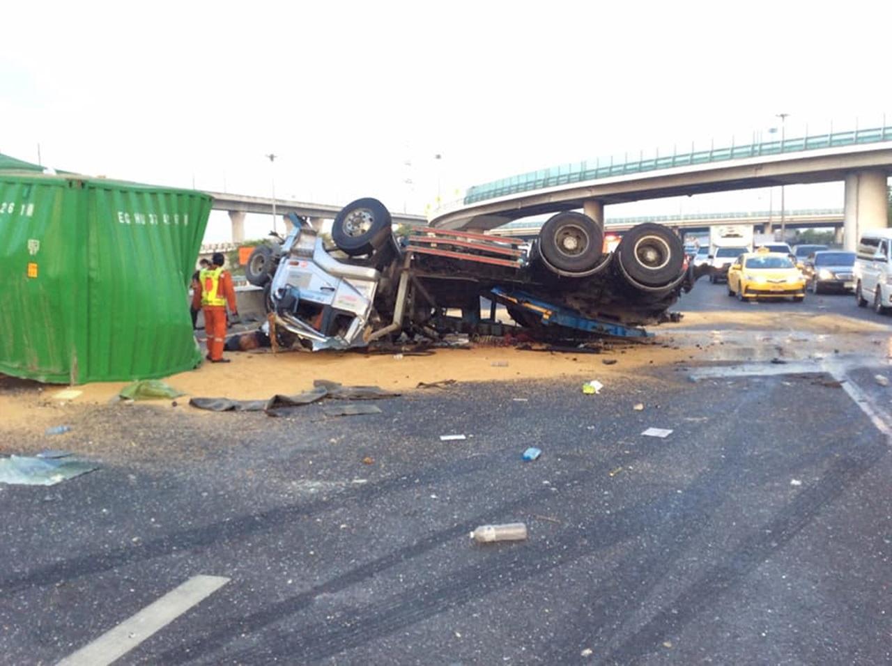 เมื่อมาถึงสะพานต่างระดับทับช้างใหม่ ผู้ขับขี่ได้ฝ่าฝืนป้ายบังคับขับรถขึ้นสะพานดังกล่าว โดยใช้ความเร็วเกินกำหนดเข้าทางโค้ง รถเกิดเสียการทรงตัวทำให้เกิดอุบัติเหตุรถพลิกคว่ำตกลงจากสะพาน ลงมาบนทางหลวงพิเศษหมายเลข 7 ตอน ถนนศรีนครินทร์-บางปะกง ที่บริเวณ กม.6+900 ด้านซ้ายทาง (มุ่งหน้าพัทยา) กีดขวางการจราจร 3 ช่องทางขวา และมีข้าวบาร์เลย์ที่บรรจุอยู่ในตู้คอนเทนเนอร์ ตกกระจาย กีดขวาง 2 ช่องทางขวา