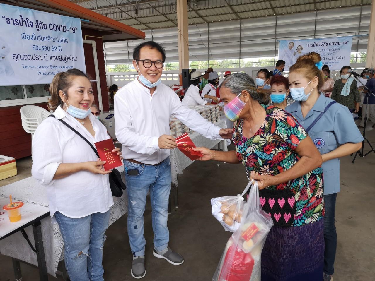 เพื่อรับซองแดงที่มีเงินภายในซองจำนวน 200 บาท ข้าวสาร ไข่ไก่ พร้อมด้วยข้าวกล่องอีก 500 ชุด จาก นางจิตปราณี เทพย์ปฎิพัธน์ หรือ ชาวบ้านเรียกว่า เจ๊ใหญ่ อายุ 62 ปี เจ้าของบริษัท ได้ถือโอกาสเนื่องในวันคล้ายวันเกิดครบรอบ อายุ 62 ปี จัดเงินใส่ซองแดงคนละ 200 บาท กว่า 500 คน รวมเป็นเงินกว่า 100,000 บาท เพื่อเป็นการช่วยเหลือบรรเทาค่าใช้จ่ายให้กับชาวบ้านฐานะยากจน และช่วยผู้ที่ไม่มีเงินในการซื้อหาอาหาร เนื่องจากตกงาน และคนที่ไม่ได้รับเงินเยียวยาจากรัฐบาล