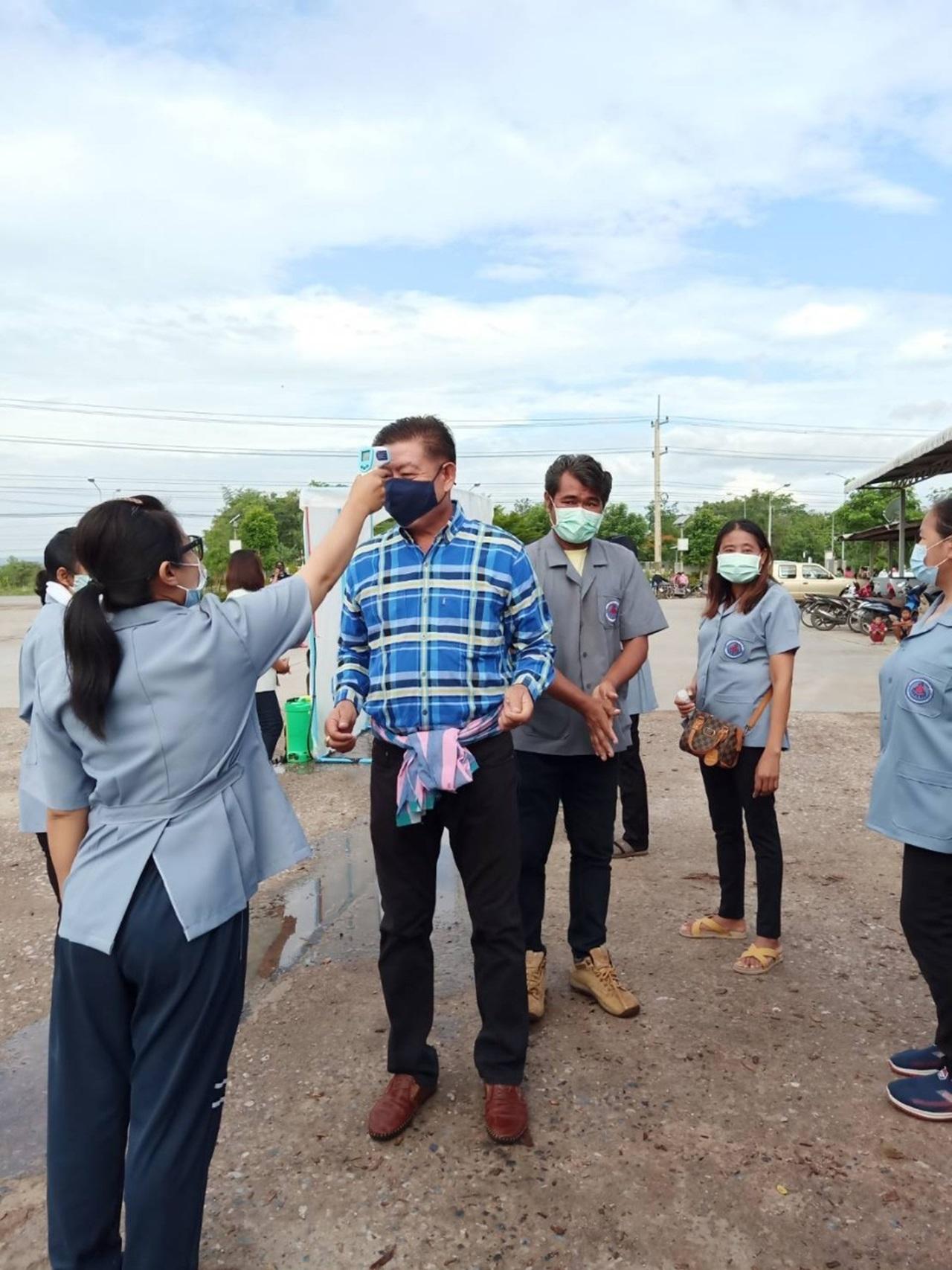 วันที่ 19 พ.ค.63 ผู้สื่อข่าวรายงานว่า ที่ห้างหุ้นส่วนจำกัด ธาตุทองวู๊ดชิพ แอนด์ พาลเลท จำกัด ใน ต.ธาตุทอง อ.ภูเขียว จ.ชัยภูมิ ได้มีชาวบ้านกว่า 500 คน มารอคิวเพื่อให้ อสม.ตั้งจุดคัดกรองตรวจวัดอุณหภูมิทุกคน ก่อนที่จะเข้าไปภายในที่นั่งที่จัดระยะห่างอย่างเป็นระเบียบเรียบร้อย