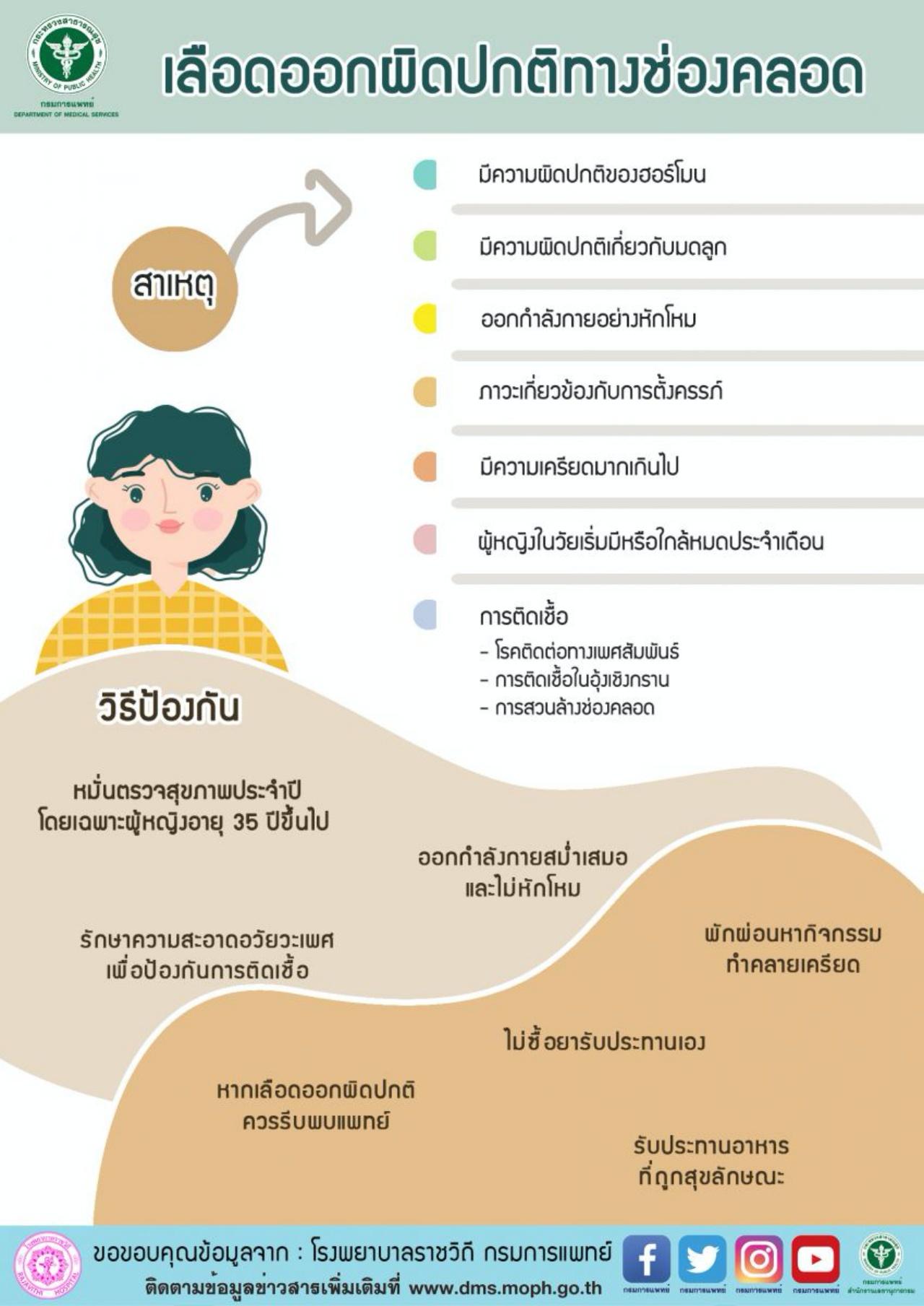 นายแพทย์สมศักดิ์ อรรฆศิลป์ อธิบดีกรมการแพทย์ กล่าวว่า การมีเลือดออกผิดปกติทางช่องคลอด เกิดได้จากหลายสาเหตุ ได้แก่ มีความผิดปกติของฮอร์โมน ภาวะเกี่ยวข้องกับการตั้งครรภ์ การติดเชื้อ ซึ่งก่อให้เกิดการอักเสบและมีเลือดออกได้ สาเหตุของการติดเชื้อ เช่น โรคติดต่อทางเพศสัมพันธ์ การสวนล้างช่องคลอด การติดเชื้อในอุ้งเชิงกราน ผู้หญิงในวัยที่เพิ่งเริ่มมีประจำเดือนหรือวัยใกล้หมดประจำเดือนมักมีภาวะฮอร์โมนแปรปรวน ก็เป็นสาเหตุของเลือดออกผิดปกติ