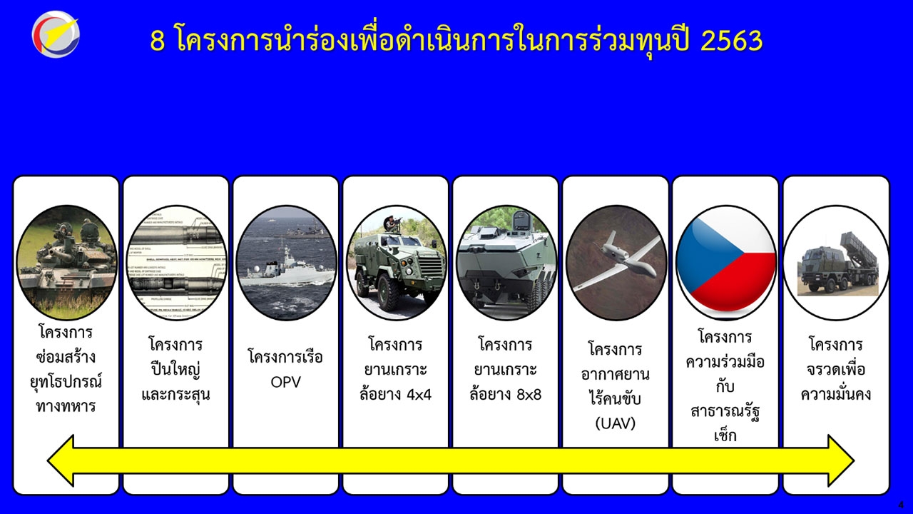 โดยทั้ง 8 โครงการอยู่ในขั้นตอนการดำเนินการทำแผนพัฒนาธุรกิจและการร่วมทุน เพื่อรองรับและสนับสนุนให้เกิดอุตสาหกรรมป้องกันประเทศ ตาม พ.ร.บ.เทคโนโลยีป้องกันประเทศ พ.ศ. 2562 ภายใต้ความร่วมมือของหน่วยงานต่างๆ ที่เกี่ยวข้องทั้งภาครัฐและภาคเอกชนทั้งในและต่างประเทศ เพื่อให้เป็นไปตามนโยบายของกระทรวงกลาโหม ซึ่งในขณะนี้ สทป. ได้เตรียมการปรับโครงสร้างองค์กรเพื่อรองรับการพัฒนาธุรกิจให้เป็นไปตามนโยบายและอำนาจหน้าที่ตาม พ.ร.บ.เทคโนโลยีป้องกันประเทศ พ.ศ. 2562 และสร้างหน่วยธุรกิจที่มีประสิทธิภาพเพื่อรองรับอุตสาหกรรมป้องกันประเทศในลักษณะเชิงพาณิชย์ต่อไป
