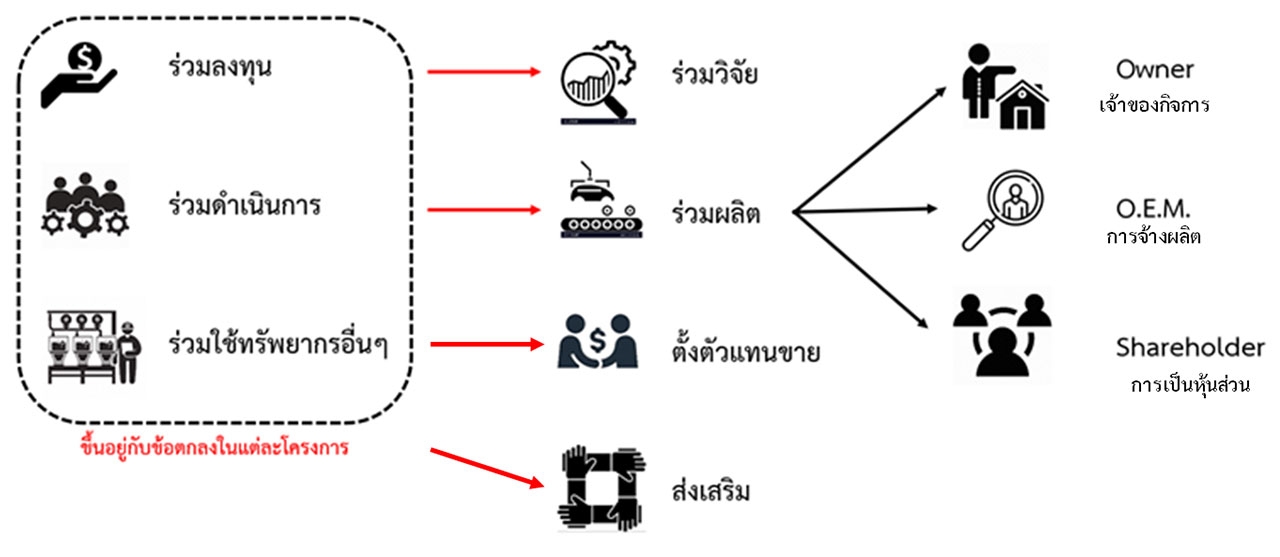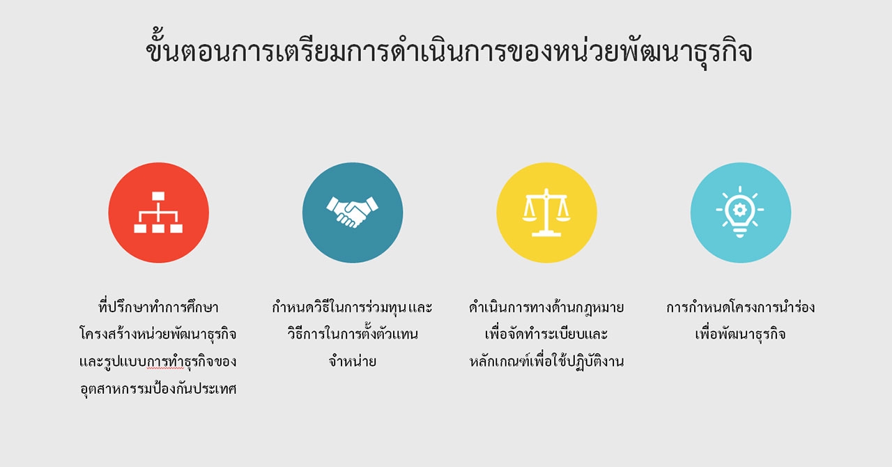 ในเบื้องต้น สทป. ได้มีแนวคิดรูปแบบหรือแนวทางการดำเนินธุรกิจเป็นลักษณะการร่วมทุน การร่วมดำเนินการ และการใช้ทรัพยากรร่วมกัน อย่างไรก็ตามการดำเนินการต่างๆ ของ สทป. ตามบทบาทใน พ.ร.บ.เทคโนโลยีป้องกันประเทศ นั้น สทป. สามารถที่ดำเนินการในรูปแบบต่างๆ ได้ อาทิ ร่วมวิจัย ร่วมผลิต การแต่งตั้งตัวแทนจำหน่าย หรือเป็นการส่งเสริมภาคเอกชนหรืออุตสาหกรรม ทั้งนี้ ให้ขึ้นอยู่กับหลักเกณฑ์การร่วมทุน และหลักเกณฑ์การตั้งผู้แทนจำหน่าย