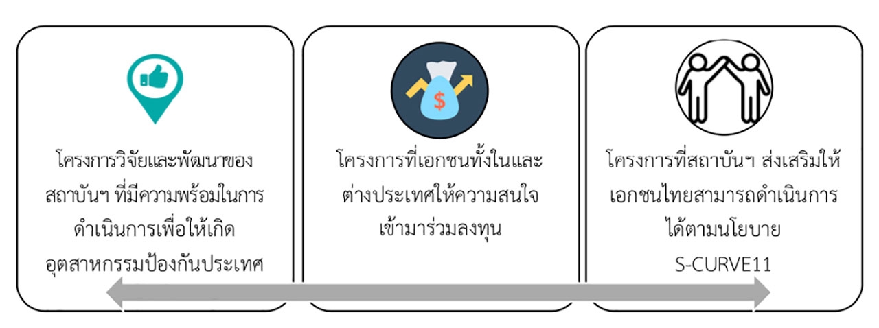 3. เป็นโครงการที่ สทป. เข้าไปส่งเสริมและสนับสนุนภาคเอกชนไทย โดยใช้อำนาจตาม พ.ร.บ. เทคโนโลยีป้องกันประเทศ พ.ศ. 2562 เพื่อให้เกิดอุตสาหกรรมป้องกันประเทศในด้านการพึ่งพาตนเอง ลดการนำเข้าซึ่งยุทโธปกรณ์จากต่างประเทศ และประหยัดงบประมาณของรัฐตามนโยบาย S – CURVE 11