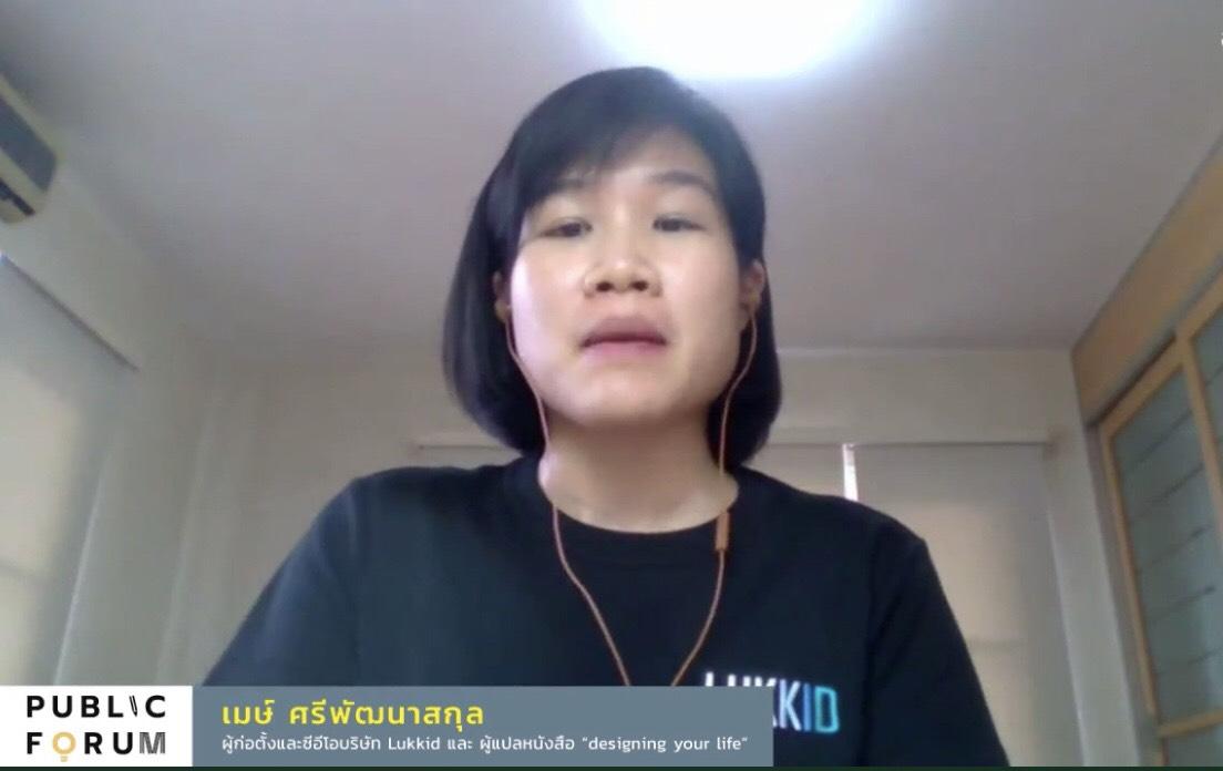 เมษ์ ศรีพัฒนาสกุล ผู้ก่อตั้งและซีอีโอบริษัท Lukkid และ ผู้แปลหนังสือ “designing your life” กล่าวว่า เราต้องปรับตัว บางครั้งการใช้เทคโนโลยีก็ไม่ได้สำคัญไปทุกสถานการณ์ บางทีระบบแมนนวลก็อาจตอบโจทย์ได้ดีกว่า เราไม่ได้มีสูตรเดียวที่ตอบโจทย์ทุกในสถานการณ์ โอกาสที่เราได้ลองจึงเป็นเรื่องสำคัญ และเราควรมีการสร้างคอมมูนิตี้เพื่อให้ครูได้คุยกันว่าเจอปัญหาอะไรแก้ไขอย่างไร ให้แต่ละคนได้แลกเปลี่ยนเรียนรู้ซึ่งกันและกัน.