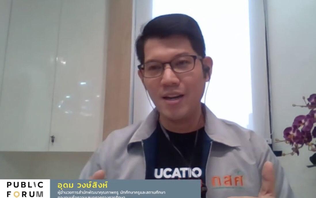 ดร.อุดม วงษ์สิงห์ ผู้อำนวยการสำนักพัฒนาคุณภาพครู นักศึกษาครูและสถานศึกษา กองทุนเพื่อความเสมอภาคทางการศึกษา (กสศ.) กล่าวว่า การทำงานของ กสศ. ที่ผ่านมามุ่งเน้นสร้างนวัตกรรมใหม่ๆ หรือนำร่อง ซึ่งเมื่อเกิดโรคระบาดเราพูดคุยให้มีการปรับการทำงาน เช่น โครงการ TSQP 290 โรงเรียนต้องปรับอะไรบ้าง ยังมีโครงการการพัฒนาโรงเรียนขนาดเล็กในพื้นที่ห่างไกล ที่ต้องให้ความช่วยเหลือมากกว่าปกติจึงต้องมาคิดว่าจะพัฒนาอย่างไร ทั้งนี้ จากตัวอย่างที่เกิดขึ้นในประเทศบรูไน เขามีระบบโฮมเลิร์นนิ่งแพ็กเกจให้ผู้ปกครองกับเด็กร่วมกันทำงานที่บ้าน รวมทั้งมีการเตรียมพร้อมจัดสภาพแวดล้อมเพื่อรองรับการเปิดเทอม ทั้งการจัดที่นั่งนักเรียน การก้าวเข้าโรงเรียน แบ่งครูออกเป็นสองกลุ่มทำงาน 2 สัปดาห์ที่โรงเรียน และหยุดสองสัปดาห์เพื่อไปลงพื้นออนไซต์ ช่วยเหลือให้คำปรึกษาเด็กในพื้นที่ ซึ่งสุดท้าย กสศ.ก็ต้องมาวิเคราะห์ย้อนกลับไปสู่เบื้องต้นคือไม่ต้องวิ่งตามเทคโนโลยีแต่ต้องเน้นไปที่การเรียนรู้