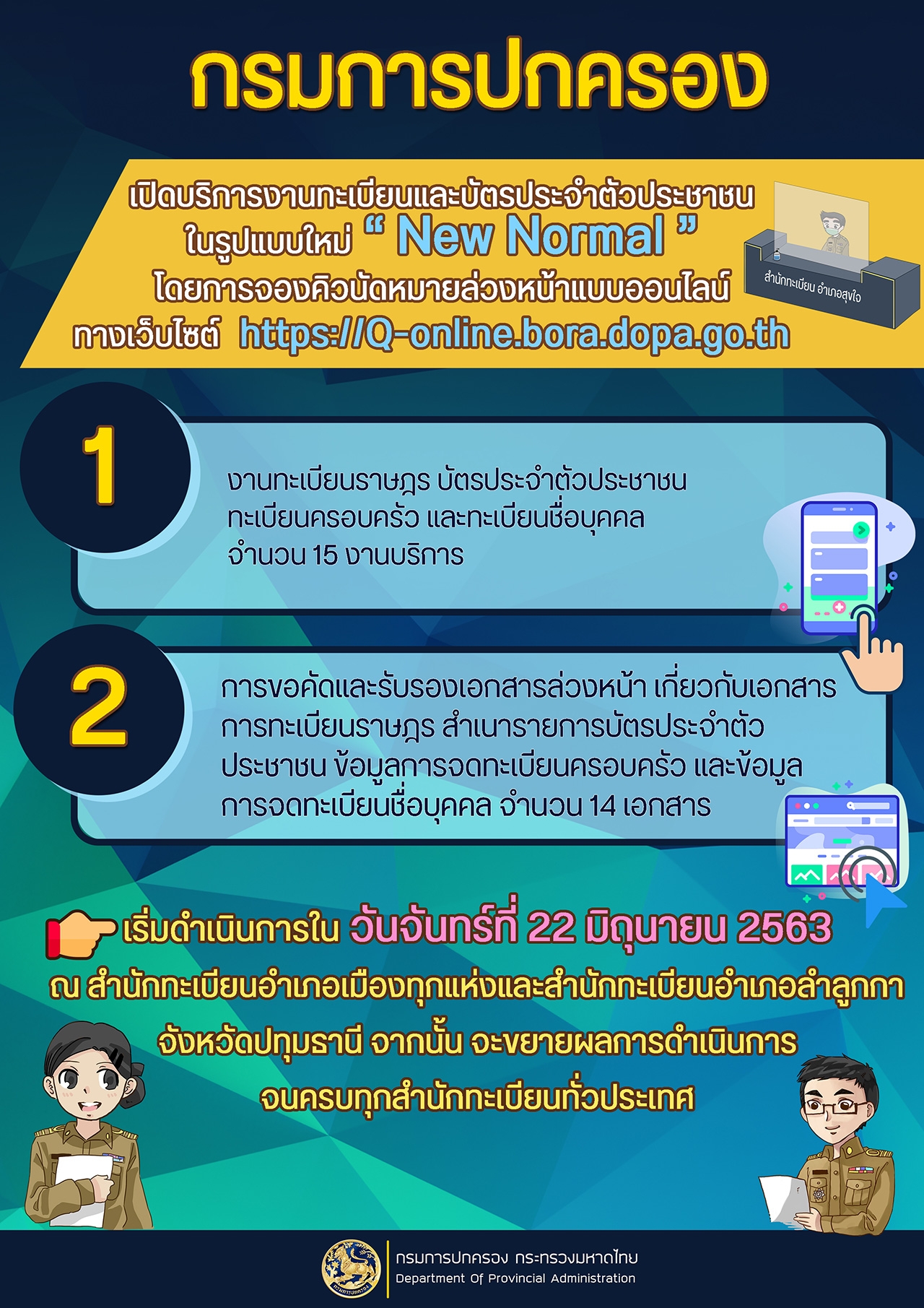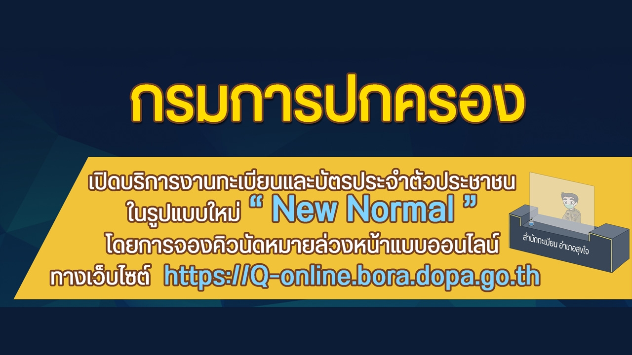 กรมการปกครองเปิดบริการงานทะเบียนและบัตรประจำตัวประชาชนในรูปแบบใหม่ “NewNormal” โดยประชาชนสามารถจองคิวนัดหมายล่วงหน้าแบบออนไลน์ ทางเว็บไซต์ https://Q-online.bora.dopa.go.th