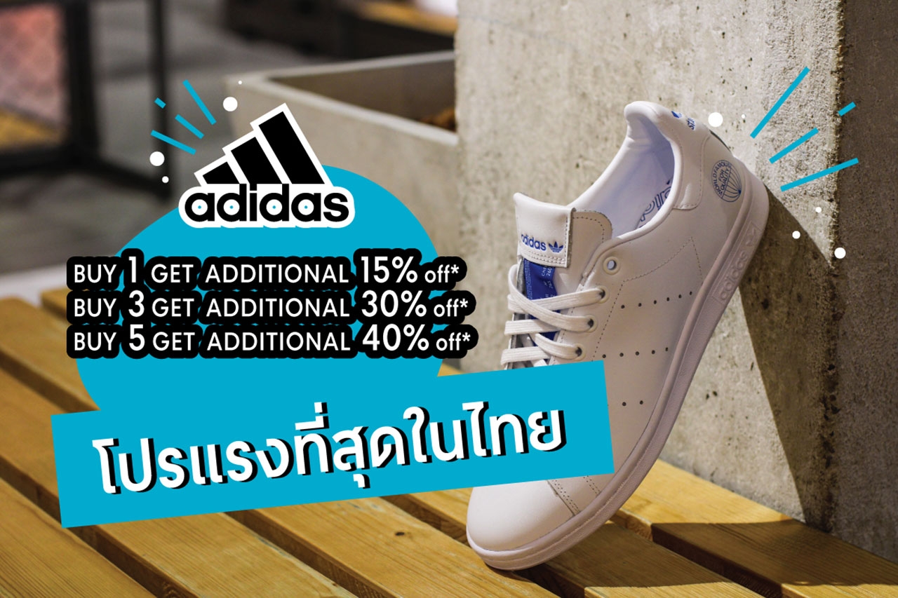 ADIDAS OUTLET เมื่อช้อปครบ 1 ชิ้น ลดเพิ่ม 15%, ช้อปครบ 3 ชิ้น ลดเพิ่ม 30%, ช้อปครบ 5 ชิ้น ลดเพิ่ม 40%