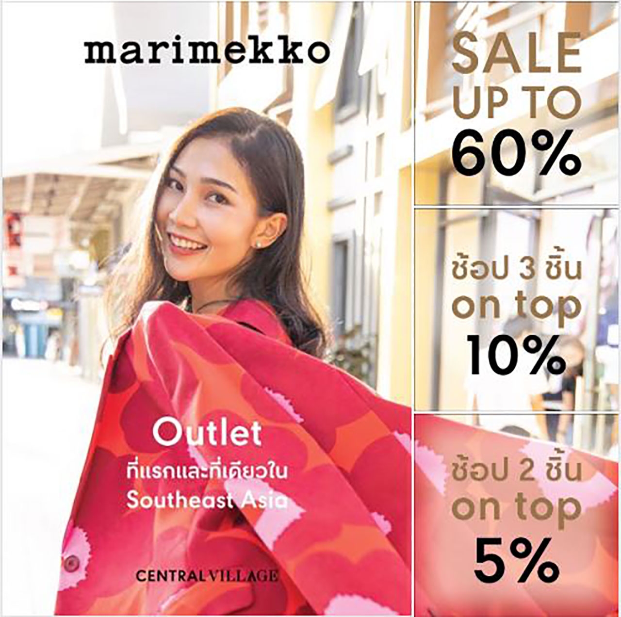 MARIMEKKO OUTLET แห่งแรกและแห่งเดียวในเอเชียตะวันออกเฉียงใต้ เมื่อช้อปครบ 2 ชิ้น ลดเพิ่ม 5%, ช้อปครบ 3 ชิ้น ลดเพิ่ม 10% พร้อม Tote Bag ลายเอ็กซ์คลูซีฟที่มีขายเฉพาะที่เซ็นทรัล วิลเลจ เท่านั้น