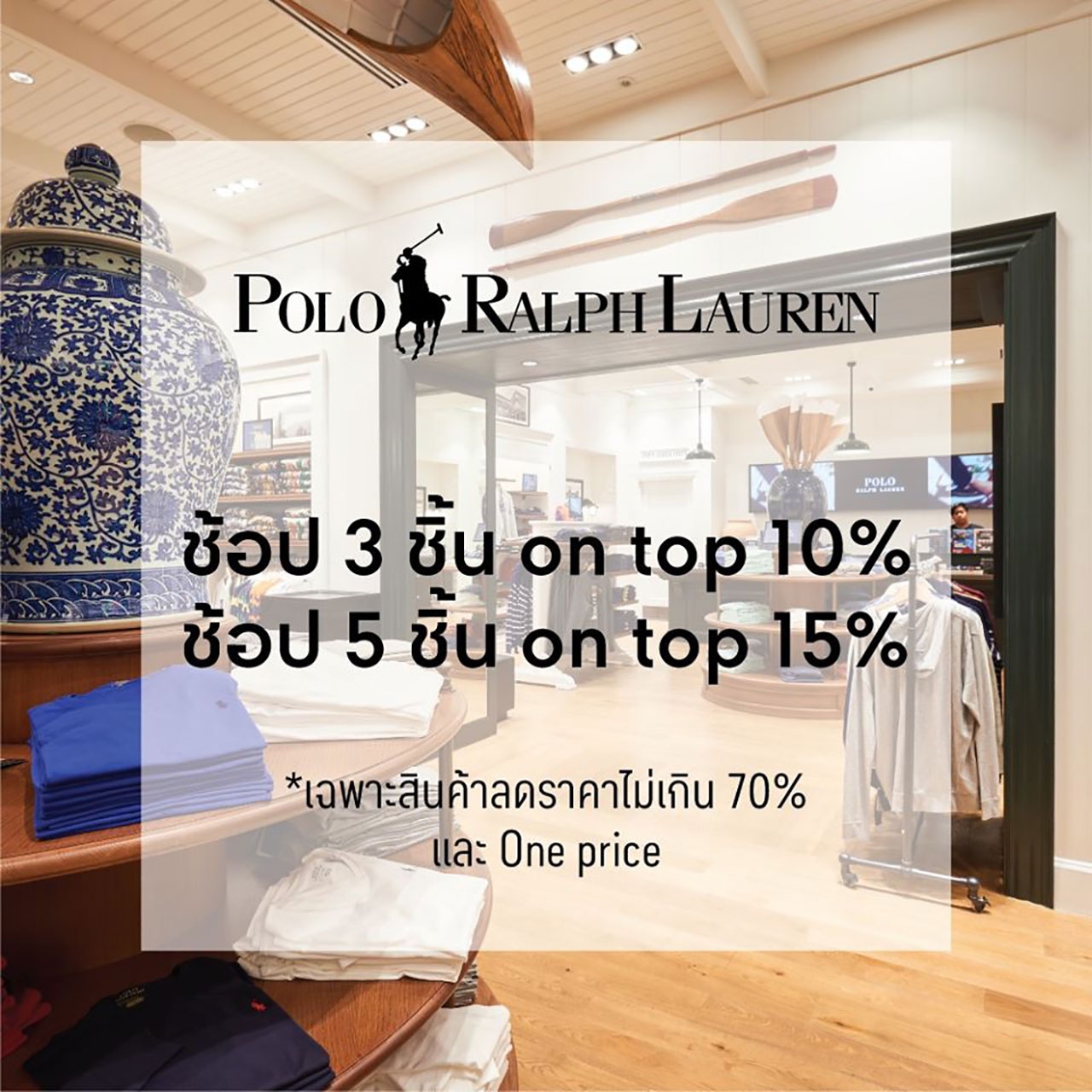POLO RALPH LAUREN OUTLET แห่งเดียวในไทย เมื่อช้อปครบ 3 ชิ้นลดเพิ่ม 10%, ช้อปครบ 5 ชิ้น ลดเพิ่ม 15%