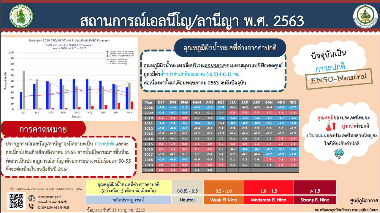 ทางด้าน กรมอุตุนิยมวิทยา เผยว่า การคาดหมายปรากฏการณ์เอลนีโญ / ลานีญา จะมีสถานะเป็น ภาวะปกติ และจะต่อเนื่องไปจนถึงสิ้นเดือนสิงหาคม 2563 จากนั้นมีโอกาสมากขึ้นที่จะพัฒนาเป็นปรากฏการณ์ลานีญาด้วยความน่าจะเป็นร้อยละ 50-55 ซึ่งจะต่อเนื่องไปจนถึงต้อนปี 2564