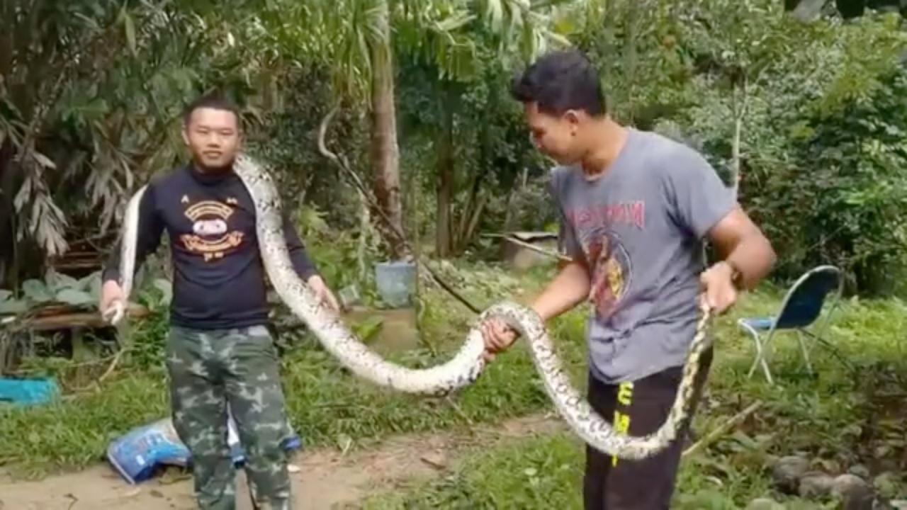 เจ้าหน้าที่อาสาสมัคร 3 นายจึงเดินทางไปตรวจสอบ เมื่อไปถึงบ้านที่ได้รับแจ้ง พบงูเหลือมเลื้อยอยู่บนต้นไม้ขนาดใหญ่ อยู่ห่างจากบ้านประมาณ 50 เมตร โดยงูเหลือมตัวดังกล่าวมีขนาดใหญ่ ยาว 5 เมตร หนักประมาณ 30 กิโลกรัม กำลังรัดและกลืนไก่อยู่บนต้นไม้