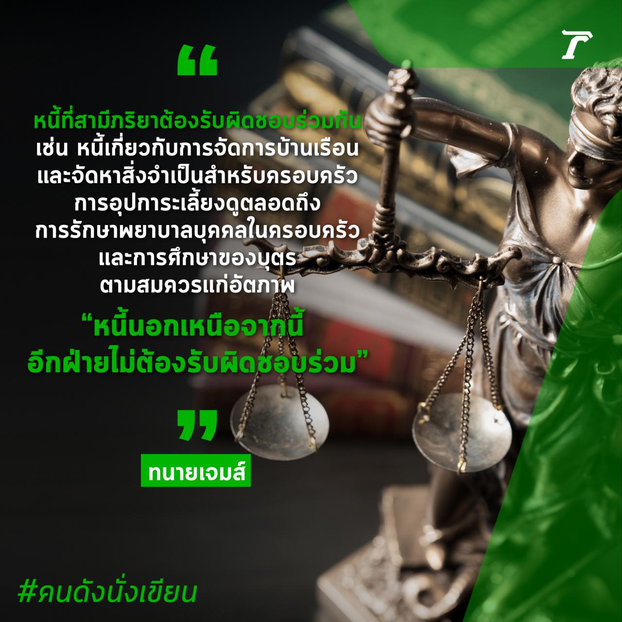 สวัสดีท่านผู้อ่านทุกท่านครับ สัปดาห์นี้มีเรื่องที่น่าสนใจและมีแฟนเพจสอบถามกันเข้ามาเยอะ ในเพจทนายเจมส์ LK เกี่ยวกับภาระหนี้สินของสามีหรือภรรยา สร้างภาระหนี้สินในระหว่างที่อยู่กินด้วยกัน ฉันสามีภรรยา หรือระหว่างสมรส อีกฝ่ายหนึ่งในฐานะที่เป็นสามีหรือภรรยา หรือคู่สมรส โดยชอบด้วยกฎหมาย จะต้องร่วมรับผิดชอบในหนี้สินดังกล่าวนั้นหรือไม่