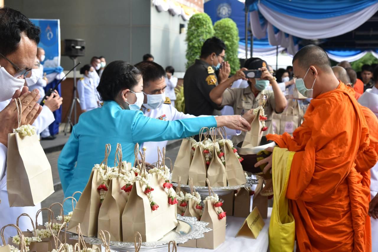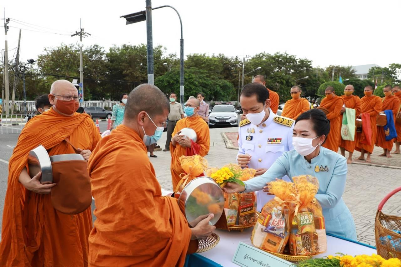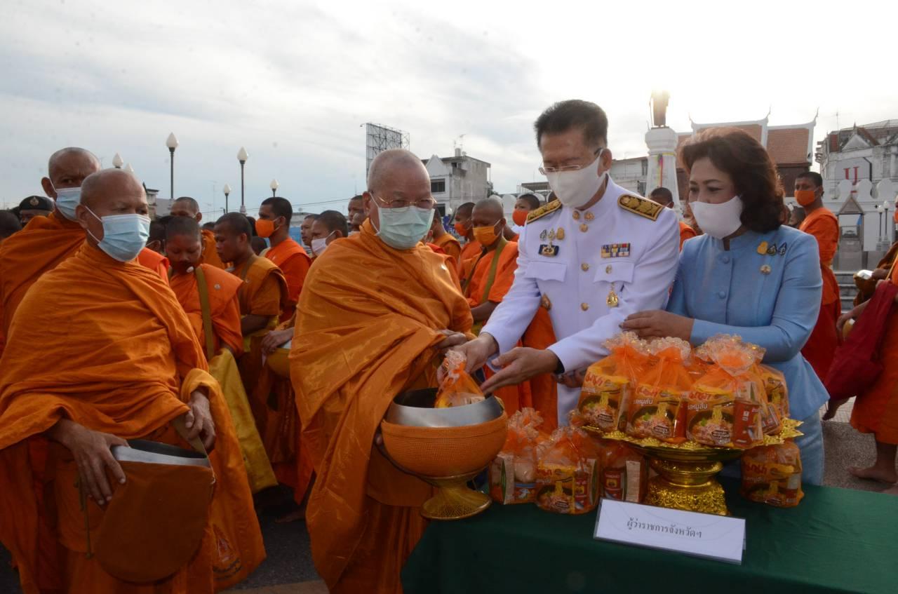 ผู้ว่าฯ นนทบุรี นำภาคส่วนต่างๆ สวมเสื้อสีฟ้าร่วมทำทำบุญตักบาตร ถวายเป็นพระราชกุศล