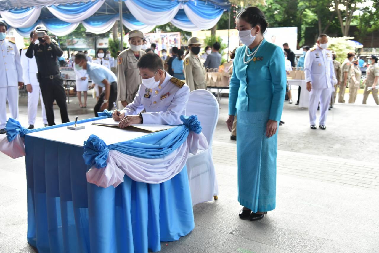 บริเวณหน้าเทศบาลนครนนทบุรี นายสุจินต์ ไชยชุมศักดิ์ ผู้ว่าราชการจังหวัดนนทบุรี เป็นประธานในพิธีทำบุญตักบาตรพระสงฆ์ จำนวน 89 รูป โดยมีพระราชนันทมุนี เจ้าคณะจังหวัดนนทบุรี/เจ้าอาวาสวัดบัวขวัญ พระอารามหลวง เป็นประธานฝ่ายสงฆ์ และมีรองผู้ว่าราชการจังหวัดนนทบุรี ผู้พิพากษาหัวหน้าศาลจังหวัดนนทบุรี ผู้แทนอัยการจังหวัดนนทบุรี รอง ผอ.รมน.จังหวัดนนทบุรี (ทหาร) ผู้แทนผู้บังคับการตำรวจภูธรจังหวัดนนทบุรี นายกเหล่ากาชาดจังหวัดนนทบุรี ปลัดจังหวัดนนทบุรี หัวหน้าสำนักงานจังหวัดนนทบุรี หัวหน้าส่วนราชการ หัวหน้าหน่วยงานรัฐวิสาหกิจ นายอำเภอ ผู้บริหารองค์กรปกครองส่วนท้องถิ่น ข้าราชการฝ่ายต่างๆ ทหาร ตำรวจ กำนัน ผู้ใหญ่บ้าน สมาชิกเหล่ากาชาดจังหวัดนนทบุรี ลูกจ้างส่วนราชการ ภาคเอกชน และประชาชนสวมใส่เสื้อสีฟ้าร่วมทำบุญตักบาตร