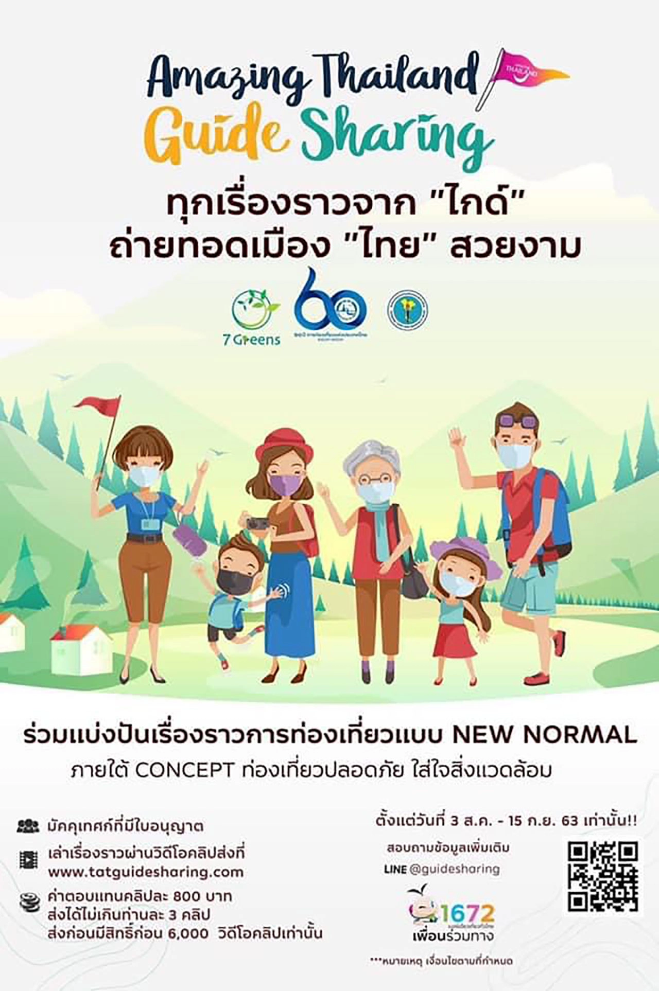 นางสาวฐาปนีย์ เกียรติไพบูลย์ รองผู้ว่าการด้านสินค้าและธุรกิจท่องเที่ยว (ททท.) กล่าวว่า ในช่วงการระบาดของโควิด-19 ที่ผ่านมา ททท. ได้ดำเนินโครงการเพื่อเตรียมความพร้อมให้อุตสาหกรรมท่องเที่ยวหลายโครงการ อาทิ โครงการ Amazing Thailand Safety & Administration (SHA) ซึ่งเป็นการสร้างมาตรฐานด้านความปลอดภัยและสุขอนามัยให้กับสถานประกอบการ 10 ประเภทกิจการในอุตสาหกรรมการท่องเที่ยว นอกจากนี้ ในส่วนของบุคลากรด้านการท่องเที่ยวโดยเฉพาะกลุ่มมัคคุเทศก์เป็นกลุ่มที่ ททท. ให้ความสำคัญเช่นกัน เนื่องจากเป็นกลุ่มที่ดูแลนักท่องเที่ยวทั้งด้านการอำนวยความสะดวก การสังเกตอาการป่วยในเบื้องต้น การให้ข้อมูลแหล่งท่องเที่ยวต่าง ๆ ซึ่งช่วงการระบาดของโควิด-19 ก็ได้รับผลกระทบอย่างหนัก ททท. จึงได้จัดทำโครงการ Amazing Thailand Guide Sharing “ทุกเรื่องราวจากไกด์ ถ่ายทอดเมืองไทยสวยงาม” โดยขอเชิญชวนมัคคุเทศก์ที่มีใบอนุญาตประกอบอาชีพถูกต้องตามกฎหมาย มาร่วมแบ่งปันเรื่องราวการท่องเที่ยววิถีใหม่ (New Normal) ในรูปแบบคลิปวิดีโอที่ถ่ายทำจากแหล่งท่องเที่ยวในประเทศไทยซึ่งเป็นสถานที่จริง ความยาวไม่เกิน 2 นาที บรรยายเป็นภาษาไทยหรือภาษาต่างประเทศที่ตนเองถนัด โดยสามารถจัดส่งผลงานผ่านเว็บไซต์ www.tatguidesharing.com ได้ตั้งแต่วันที่ 3 สิงหาคม - 15 กันยายน 2563 ซึ่ง 6,000 วิดีโอคลิปแรกเท่านั้น จะได้รับเงินรางวัลคลิปละ 800 บาท โดย 1 คน สามารถส่งผลงานได้สูงสุด 3 วิดีโอคลิป พร้อมร่วมเป็นส่วนหนึ่ง ในการผลิตสื่อสร้างการรับรู้การท่องเที่ยวไทยโดยสื่อสารผ่านตัวมัคคุเทศก์ จำนวน 30 เรื่องราว ซึ่ง ททท. จะทำการเผยแพร่ผ่านช่องทางออนไลน์สู่สายตานักท่องเที่ยวทั้งชาวไทยและชาวต่างชาติต่อไป
