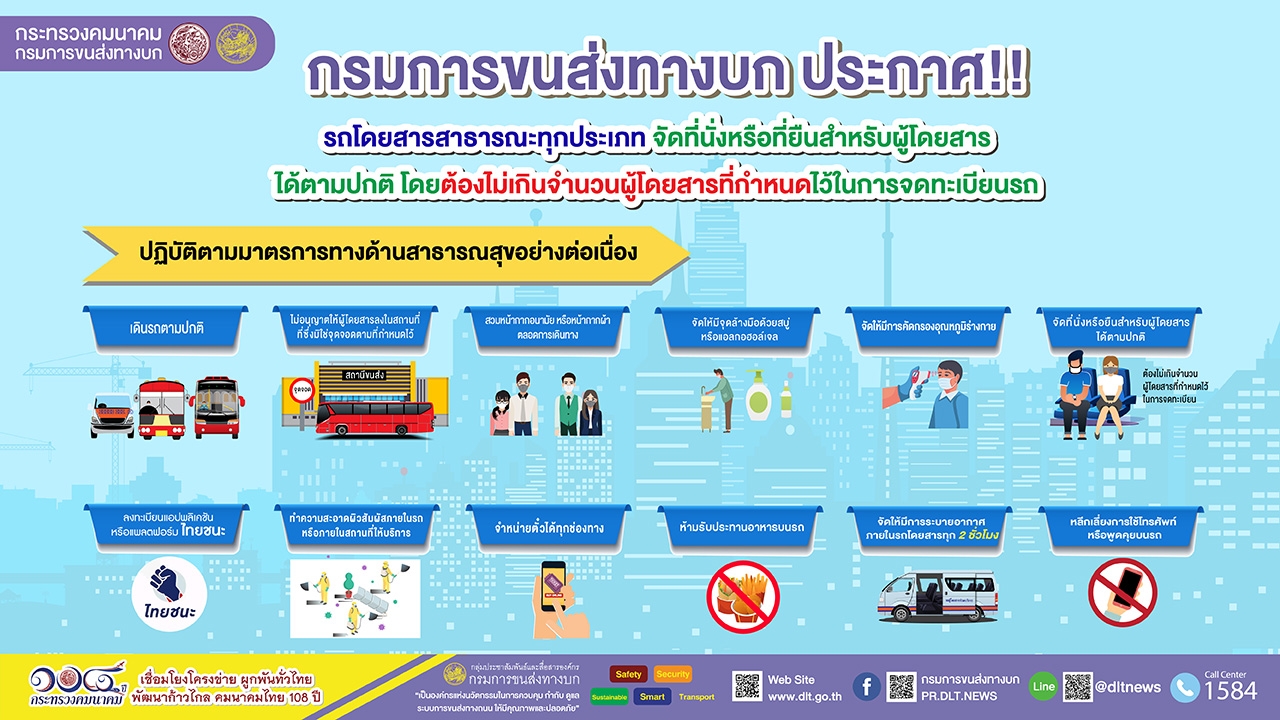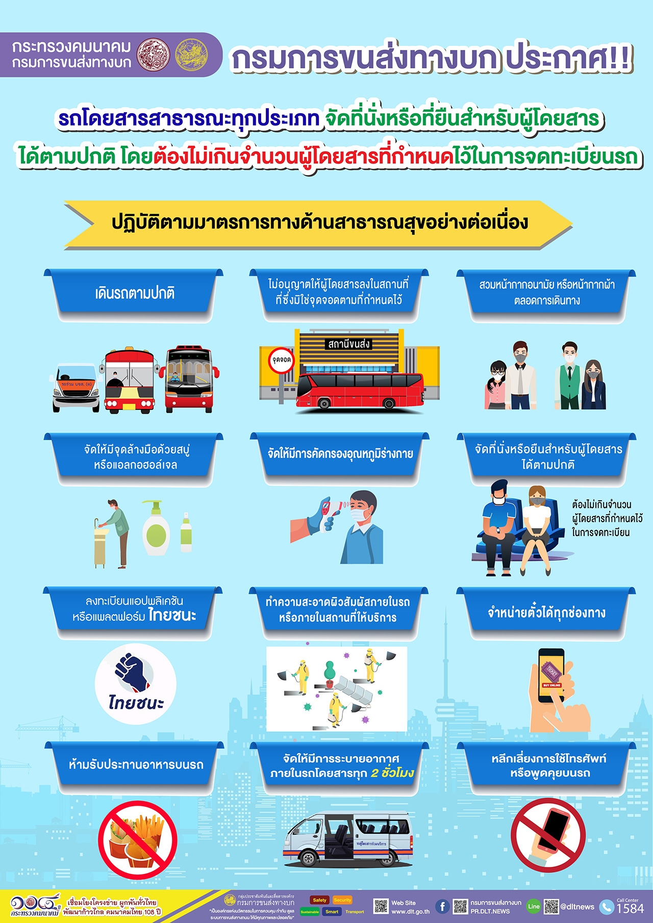 กรมการขนส่งทางบก ประกาศ!! รถโดยสารสาธารณะทุกประเภท สามารถจัดที่นั่งหรือที่ยืนสำหรับผู้โดยสารได้ตามปกติ โดยต้องไม่เกินจำนวนผู้โดยสารที่กำหนดไว้ในการจดทะเบียนรถ ย้ำ!!! ผู้โดยสารต้องสวมหน้ากากอนามัยหรือหน้ากากผ้าตลอดการเดินทาง และเช็กอิน-เช็กเอาต์ไทยชนะทุกครั้งที่ใช้บริการรถโดยสารสาธารณะ และสถานีขนส่งผู้โดยสาร