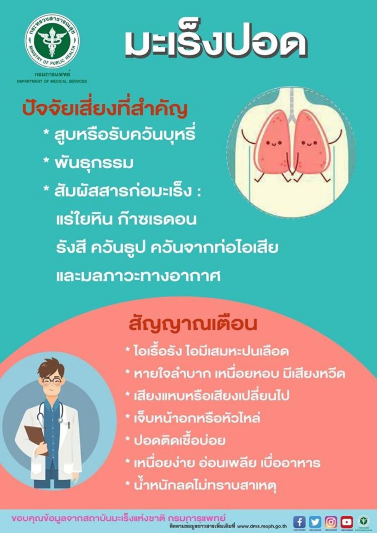 กรมการแพทย์ ชี้สัญญาณเตือน "มะเร็งปอด" ไอเรื้อรัง หายใจลำบาก เจ็บหน้าอก แนะประชาชนตรวจคัดกรองมะเร็งปอด หากพบระยะเริ่มต้น และเข้ารับการรักษาตั้งแต่แรกๆ จะช่วยลดความเสี่ยงการเสียชีวิตลงได้