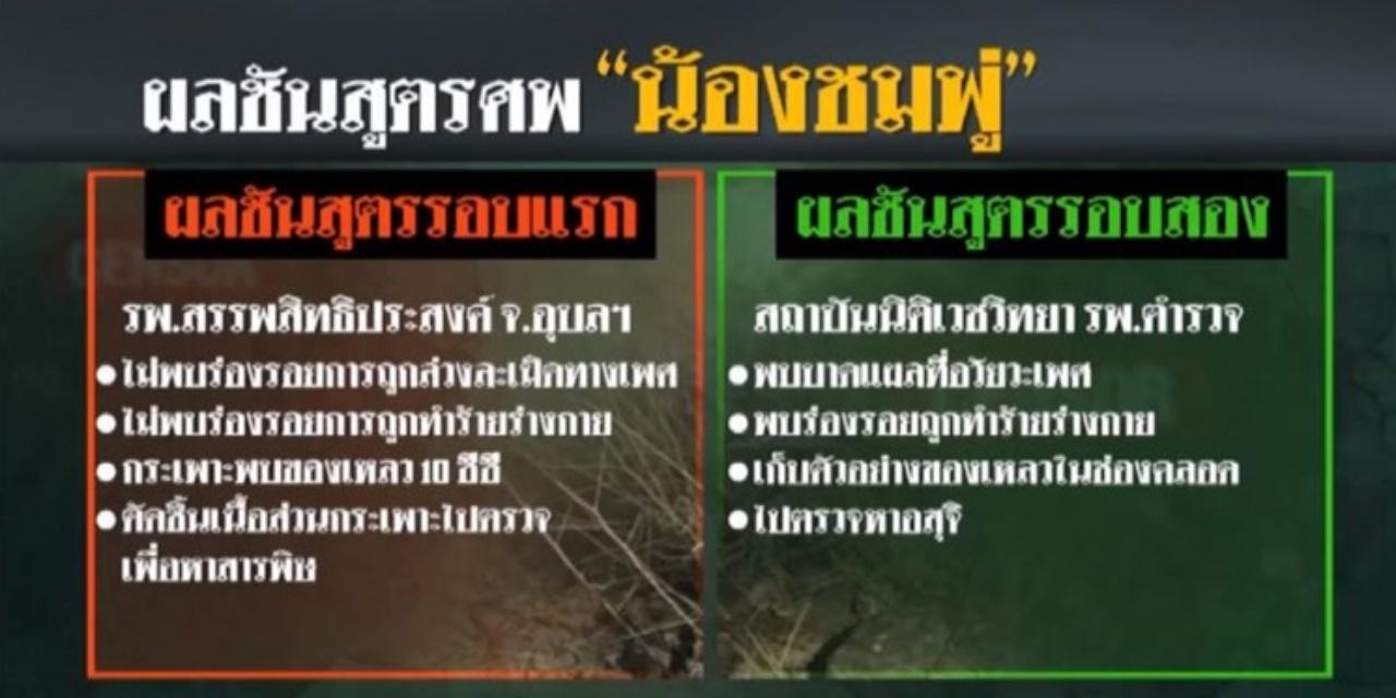 - แผนกนิติเวช โรงพยาบาลสรรพสิทธิประสงค์อุบลราชธานี ยืนยันผลการตรวจชันสูตรน้องชมพู่ ไม่พบร่องรอยการถูกทำร้าย และการล่วงละเมิดทางเพศ ระบุเพียง "ไม่ปรากฏสาเหตุการตาย แต่พบบาดแผลตามร่างกายและอวัยวะเพศ" ซึ่งยังไม่สามารถระบุได้ชัดเจนว่าเกิดจากทำร้ายร่างกาย ล่วงละเมิด หรือสาเหตุใดแน่ชัด