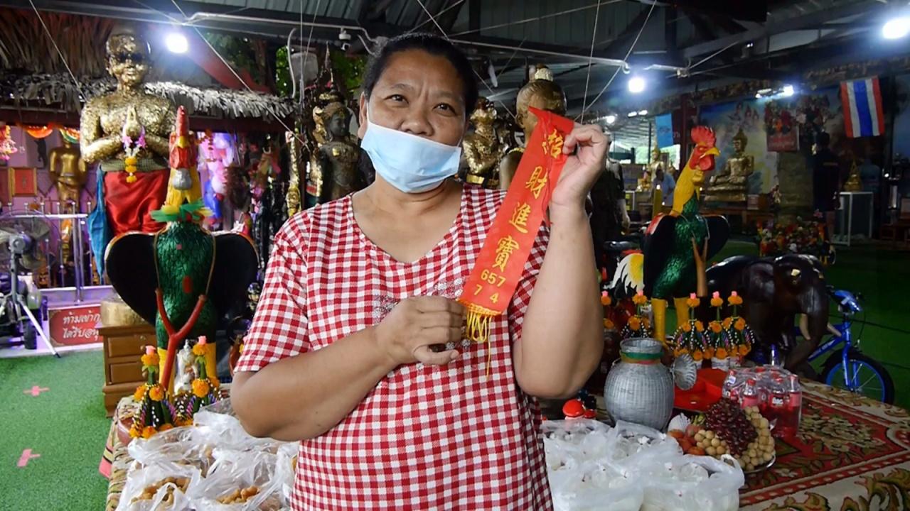 โดยบอกว่าหากชีวิตดีขึ้นมีโชคลาภ จะนำน้ำเต้าหู้พร้อมปาท่องโก๋มาถวายจำนวน 100 ชุด และประทัด 1,000 นัด จนตนมีโชคลาภและประสบความสำเร็จดังที่ขอไว้ วันนี้ตนจึงนำน้ำเต้าหู้พร้อมปาท่องโก๋ และประทัดมาถวายแก้บนตามที่สัญญาไว้ ส่วนเลขปลายประทัดที่ตนจุดแก้บนคือ 657 และเลข 74.
