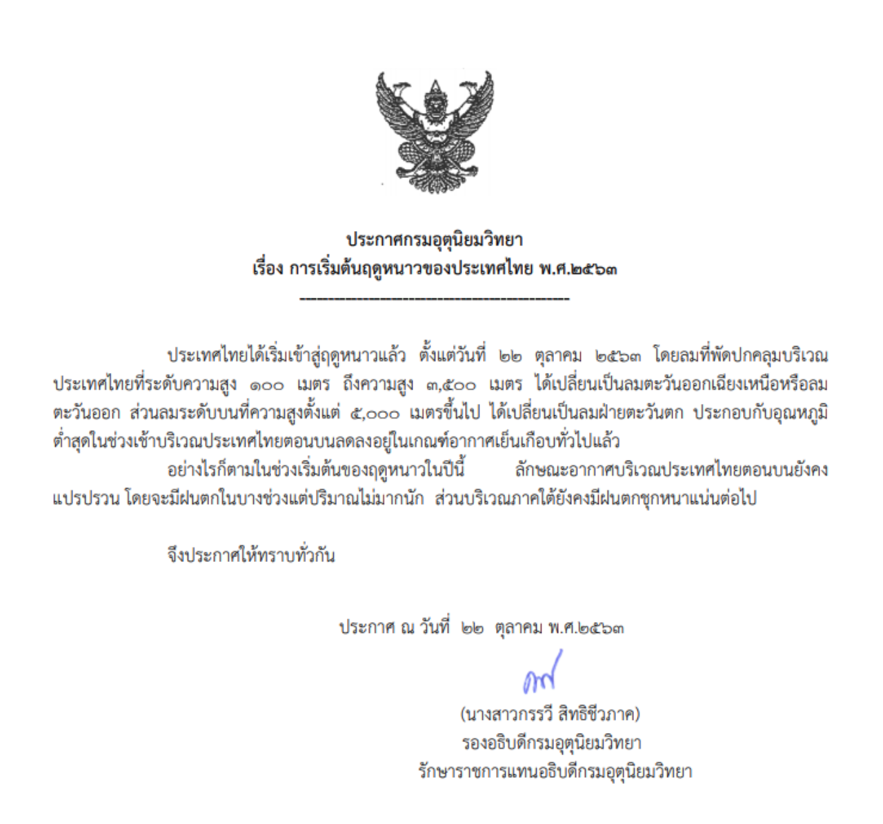 กรมอุตุนิยมวิทยา ประกาศ ประเทศไทยได้เริ่มต้นเข้าสู่ "ฤดูหนาว" แล้ว ตั้งแต่วันนี้ 22 ตุลาคม 2563 โดยจะมีฝนตกในบางช่วง แต่ปริมาณไม่มากนัก