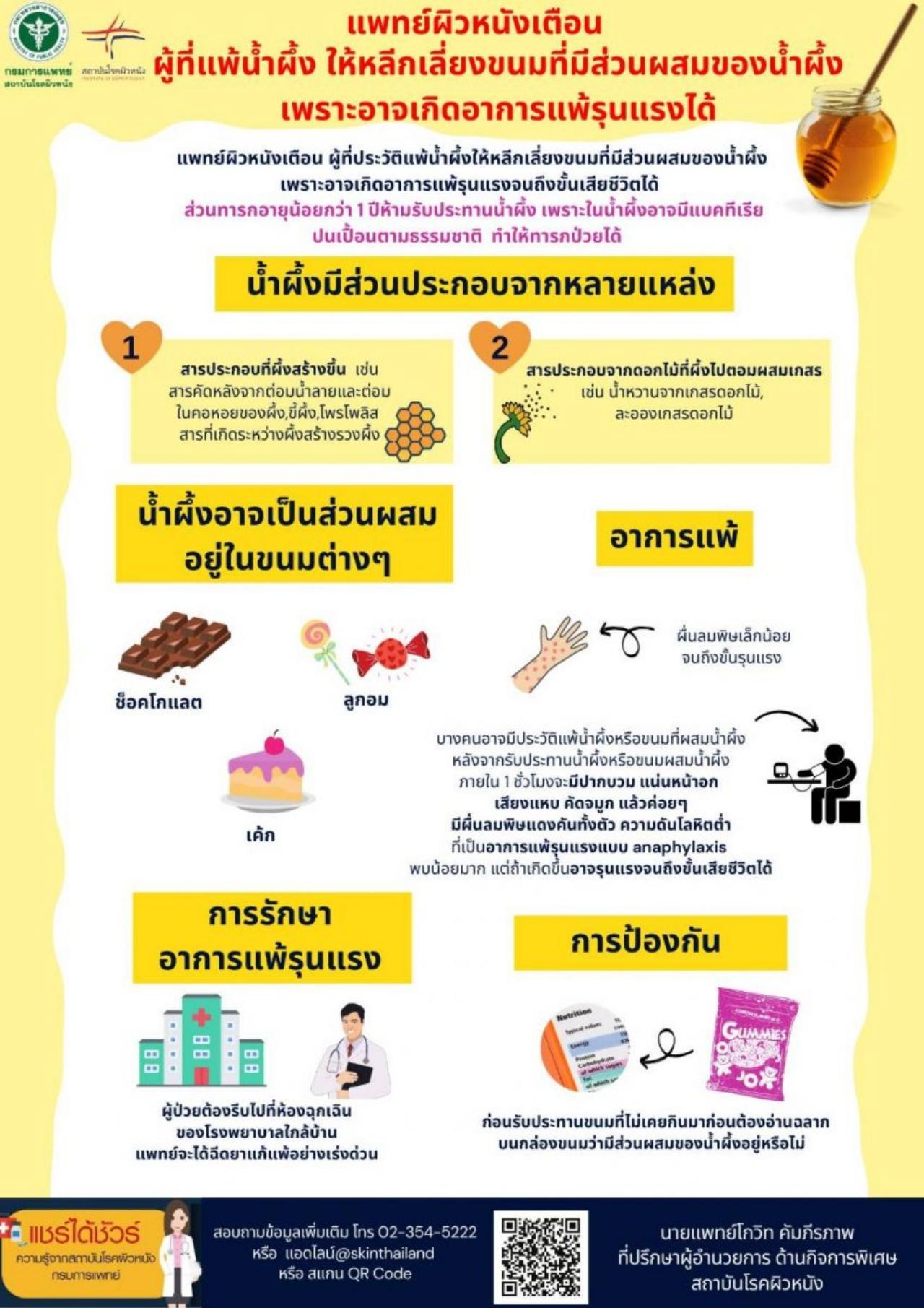 กรมการแพทย์ เตือนผู้ที่แพ้ "น้ำผึ้ง" โปรดหลีกเลี่ยงขนมที่มีส่วนผสมของน้ำผึ้ง เพราะอาจเกิดอาการแพ้รุนแรง จนถึงขั้นเสียชีวิตได้